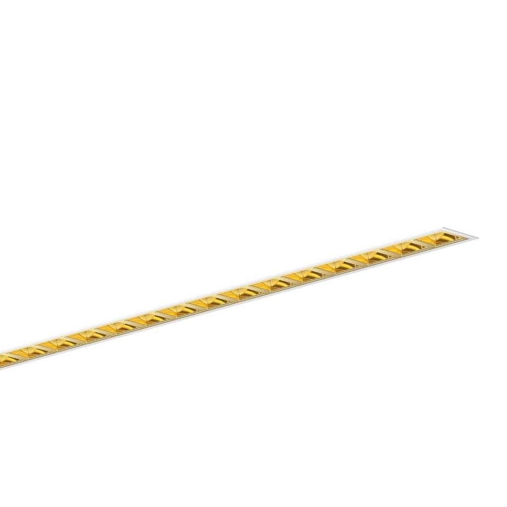 Nouveau luminaire de bureau profilé LED de grande qualité, en aluminium extrudé avec surface thermolaquée en blanc ’RAL9016’ pour le montage en encastré dans faux plafonds (de 10 à 40 mm d’épaisseur), ressorts de montage inclus, et l’éclairage direct. Diffusion directe de la lumière par Grille 'high-gloss gold'. Convertisseur DALI pour gradation inclus. Luminaire équipé d’une technologie LED innovante avec une efficacité de 115 lm par W et une flux lumineux sortant de 6420 lm lm pour 56 W, en température de couleur 3000 K (nominale), 2895 K (effective). Evaluation de l'éblouissement selon la classification selon DIN EN 12464-1.2021-11 avec UGR < 16, luminaire de poste de travail compatible écran selon DIN EN 12464-1 (luminosité à 65° <= 1000 cd/m²), indice de rendu des couleurs (IRC) > 90, indice de protection IP20, classe de protection I, Groupe de risque RG0 selon norme IEC 62471, durée de vie nominale > 60.000 h [selon le décret de l’UE]. Sur demande également en version d’éclairage d’urgence, batterie 3h. Possibilité de connexion optique bout à bout de deux ou plusieurs luminaires par le biais d'accessoires en option, Option de commutateur : C, source lumineuse remplaçable par le fabricant, dispositif de commande remplaçable par un professionnel autorisé, Dimensions LxlxH : 1696x64x048 mm, Découpe LxlxH : 1690x58x060 mm avec verrouillage de transport desserré, hauteur d’encastrement de 60 à 90 mm pour plafonds 10 à 40 mm. Hauteur d’encastrement de 60 mm pour plafonds de 10 mm d’épaisseur, embouts inclus, poids : 3,4 kg