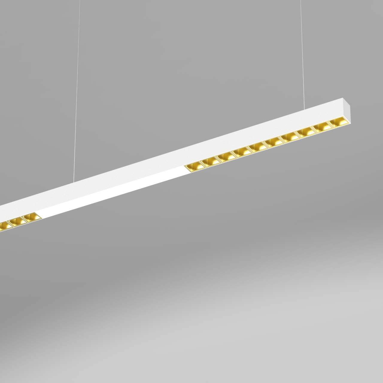 Nouveau luminaire de bureau spéciale profilé LED de grande qualité, en aluminium extrudé optimisé pour les postes de travail standard, idéal pour une table de 160 x 80 cm, avec surface thermolaquée en blanc ’RAL9016’ pour le montage en suspension, et l’éclairage direct/indirect. Diffusion directe de la lumière par Grille 'glaring gold'. Diffuseur indirect en polycarbonate transparent. alimentation transparent 1750 mm avec patère blanche en saillie (lxLxH: 130x55x25 mm) inclus. Solution élégante pour le câble d’alimentation, embouts inclus. Installation par câbles de suspension (longueur max. 1500 mm), avec réglage de la longueur en continu par tendeurs rapides. Convertisseur DALI pour gradation inclus. Luminaire équipé d’une technologie LED innovante avec une efficacité de 88 lm par W et une flux lumineux sortant de 4130 lm lm pour 47 W, en température de couleur 3000 K (nominale), 2972 K (effective). Evaluation de l'éblouissement selon la classification selon DIN EN 12464-1.2021-11 avec UGR < 16, luminaire de poste de travail compatible écran selon DIN EN 12464-1 (luminosité à 65° <= 3000 cd/m²), indice de rendu des couleurs (IRC) > 90, indice de protection IP20, classe de protection I, Groupe de risque RG0 selon norme IEC 62471, durée de vie nominale > 60.000 h [selon le décret de l’UE]. Des câbles design de différentes longueurs et couleurs sont disponibles en option pour l'alimentation, Option de commutateur : C, source lumineuse remplaçable par le fabricant, dispositif de commande remplaçable par un professionnel autorisé, Dimensions LxlxH : 1404x50x066 mm, embouts inclus, poids : 3,3 kg