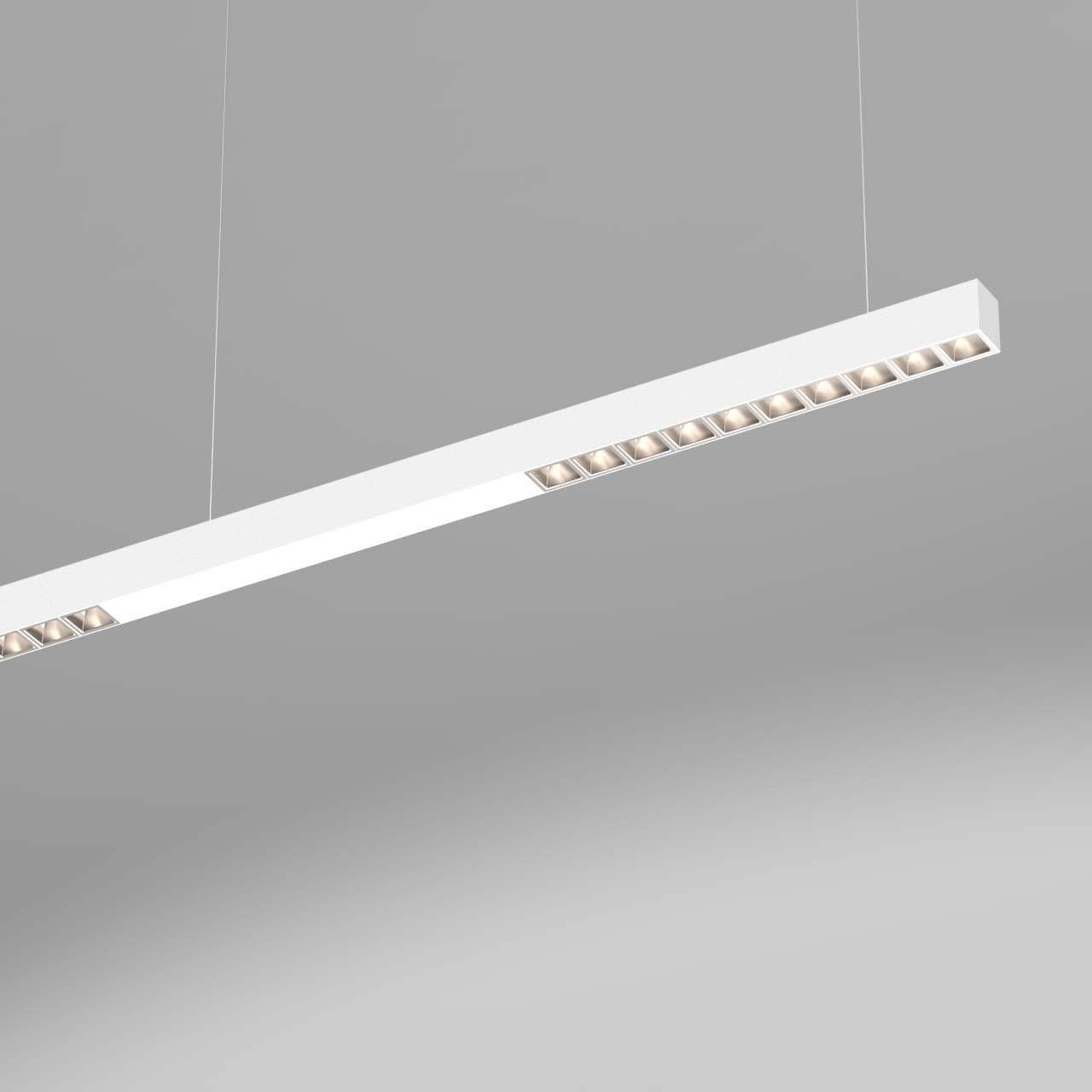Nouveau luminaire de bureau spéciale profilé LED de grande qualité, en aluminium extrudé optimisé pour les postes de travail standard, idéal pour une table de 180/200 x 100 cm, avec surface thermolaquée en blanc ’RAL9016’ pour le montage en suspension, et l’éclairage direct/indirect. Diffusion directe de la lumière par Grille 'gunnery grey'. Diffuseur indirect en polycarbonate transparent. alimentation transparent 1750 mm avec patère blanche en saillie (lxLxH: 130x55x25 mm) inclus. Solution élégante pour le câble d’alimentation, embouts inclus. Installation par câbles de suspension (longueur max. 1500 mm), avec réglage de la longueur en continu par tendeurs rapides. Convertisseur DALI pour gradation inclus. Luminaire équipé d’une technologie LED innovante avec une efficacité de 91 lm par W et une flux lumineux sortant de 4438 lm lm pour 49 W, en température de couleur 3000 K (nominale), 3017 K (effective). Evaluation de l'éblouissement selon la classification selon DIN EN 12464-1.2021-11 avec UGR < 16, indice de rendu des couleurs (IRC) > 90, indice de protection IP20, classe de protection I, Groupe de risque RG0 selon norme IEC 62471, durée de vie nominale > 60.000 h [selon le décret de l’UE]. Des câbles design de différentes longueurs et couleurs sont disponibles en option pour l'alimentation, Option de commutateur : C, source lumineuse remplaçable par le fabricant, dispositif de commande remplaçable par un professionnel autorisé, Dimensions LxlxH : 1684x50x066 mm, embouts inclus, poids : 4,5 kg
