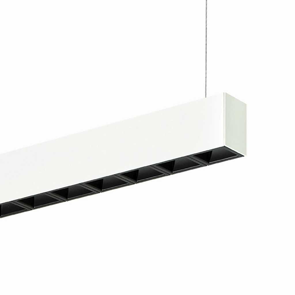 Nouveau luminaire de bureau profilé LED de grande qualité, en aluminium extrudé avec surface thermolaquée en blanc ’RAL9016’ pour le montage en suspension, et l’éclairage direct. Diffusion directe de la lumière par Grille 'black matte'. alimentation transparent 1750 mm avec patère blanche en saillie (lxLxH: 130x55x25 mm) inclus. Solution élégante pour le câble d’alimentation, embouts inclus. Installation par câbles de suspension (longueur max. 1500 mm), avec réglage de la longueur en continu par tendeurs rapides. Convertisseur DALI pour gradation inclus. Luminaire équipé d’une technologie LED innovante avec une efficacité de 64 lm par W et une flux lumineux sortant de 2442lm pour 38 W, en température de couleur 4000 K (nominale), 4029 K (effective). Evaluation de l'éblouissement selon la classification selon DIN EN 12464-1.2021-11 avec UGR < 16, luminaire de poste de travail compatible écran selon DIN EN 12464-1 (luminosité à 65° <= 1000 cd/m²), indice de rendu des couleurs (IRC) > 90, indice de protection IP20, classe de protection I, Groupe de risque RG0 selon norme IEC 62471, durée de vie nominale > 60.000 h [selon le décret de l’UE]. Sur demande également en version d’éclairage d’urgence, batterie 3h. Des câbles design de différentes longueurs et couleurs sont disponibles en option pour l'alimentation, Option de commutateur : C, source lumineuse remplaçable par le fabricant, dispositif de commande remplaçable par un professionnel autorisé, Dimensions LxlxH : 1124x50x066 mm, embouts inclus, poids : 3,0 kg