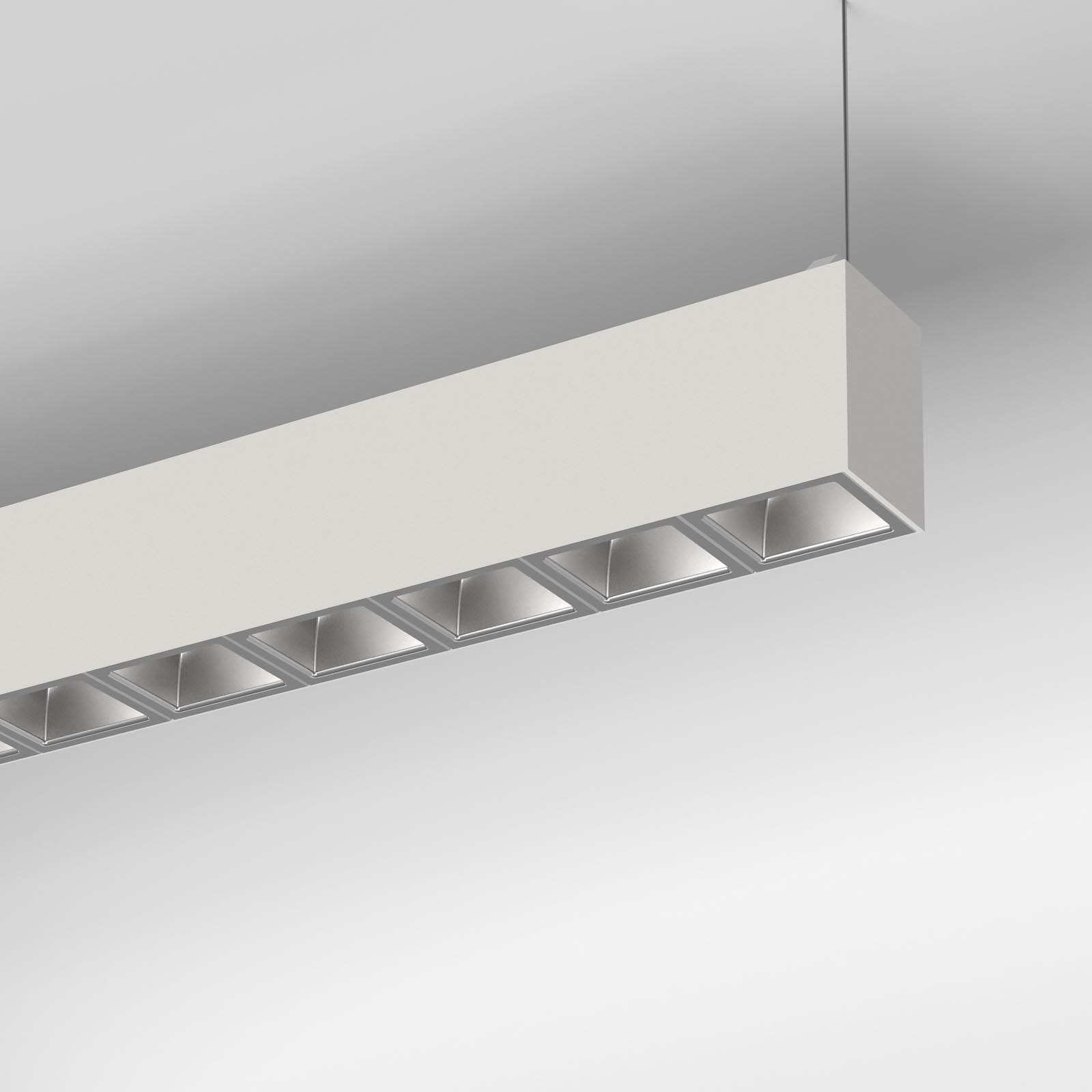 Nouveau luminaire de bureau profilé LED de grande qualité, en aluminium extrudé avec surface thermolaquée en blanc ’RAL9016’ pour le montage en suspension, et l’éclairage direct/indirect. Diffusion directe de la lumière par Grille Parabolic Louvre Flat 'silver semi-matte'. Diffuseur indirect en polycarbonate transparent. alimentation transparent 1750 mm avec patère blanche en saillie (lxLxH: 130x55x25 mm) inclus. Solution élégante pour le câble d’alimentation, embouts inclus. Installation par câbles de suspension (longueur max. 1500 mm), avec réglage de la longueur en continu par tendeurs rapides. Convertisseur DALI pour gradation inclus. Luminaire équipé d’une technologie LED innovante avec une efficacité de 125 lm par W et une flux lumineux sortant de 11248lm pour 90 W, en température de couleur 4000 K (nominale), 4028 K (effective). Evaluation de l'éblouissement selon la classification selon DIN EN 12464-1.2021-11 avec UGR < 19, luminaire de poste de travail compatible écran selon DIN EN 12464-1 (luminosité à 65° <= 3000 cd/m²), indice de rendu des couleurs (IRC) > 90, indice de protection IP20, classe de protection I, Groupe de risque RG0 selon norme IEC 62471, durée de vie nominale > 60.000 h [selon le décret de l’UE]. Sur demande également en version d’éclairage d’urgence, batterie 3h. Des câbles design de différentes longueurs et couleurs sont disponibles en option pour l'alimentation, Option de commutateur : C, source lumineuse remplaçable par le fabricant, dispositif de commande remplaçable par un professionnel autorisé, Dimensions LxlxH : 2244x50x066 mm, embouts inclus, poids : 6,0 kg