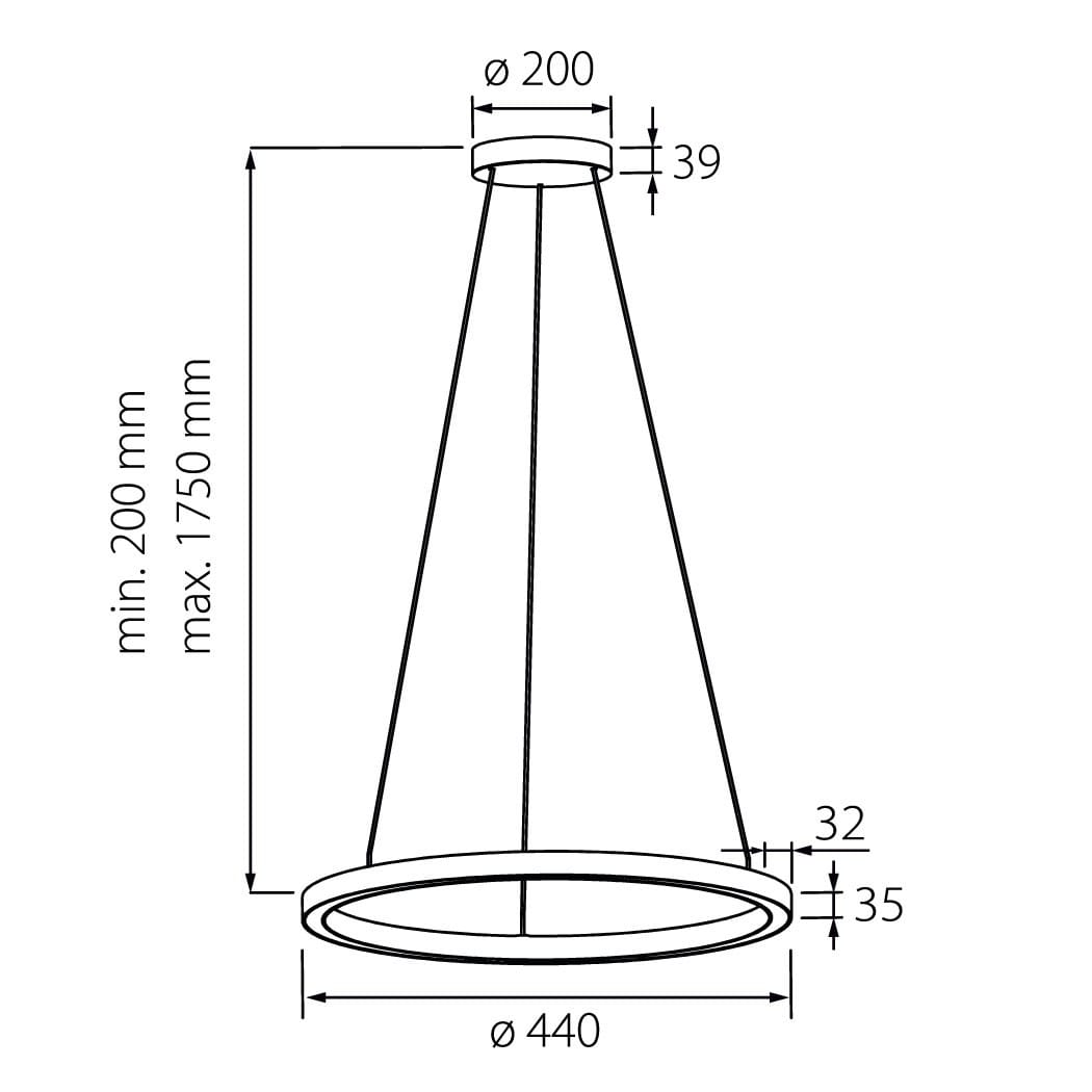 Anneau lumineux LED de grande qualité avec boîtier de luminaire, composé de Aluminium, avec surface thermolaquée en argent ’RAL9006’, structure fine mate, pour un montage en suspension au centre de la fusion, et pour éclairage direct. Installation par 3 filins de suspension 1500 mm avec tendeurs rapides, avec réglage de la longueur. Raccordement électrique par 5 pôles utilisés et câble d’alimentation noir et patère argent de plafond, 200x39 mm (DMxH), positionnement centré. Positionnement de la patère au choix centré, suspension centrale de type Z, fusion centrale. Diffuseur en satiné pour un éclairage homogène. Luminaire équipé d’une technologie LED innovante avec une efficacité de 106 lm par W et une flux lumineux sortant de Convertisseur DALI pour gradation inclus, Nombre d’adresses DALI : 1, Evaluation de l'éblouissement selon la classification selon DIN EN 12464-1.2021-11 avec UGR < 28, Indice de rendu des couleurs (IRC) > 90, tolérance chromatique étroite MacAdam 3, Indice de protection IP20, classe de protection I, Groupe de risque RG = 0 selon norme IEC 62471, durée de vie nominale > 60.000 h [selon le décret de l’UE]. Option de commutateur : C, Dimensions DMxH : 0440x035 mm, largeur de la section 54 mm. Poids : 2,0 kg