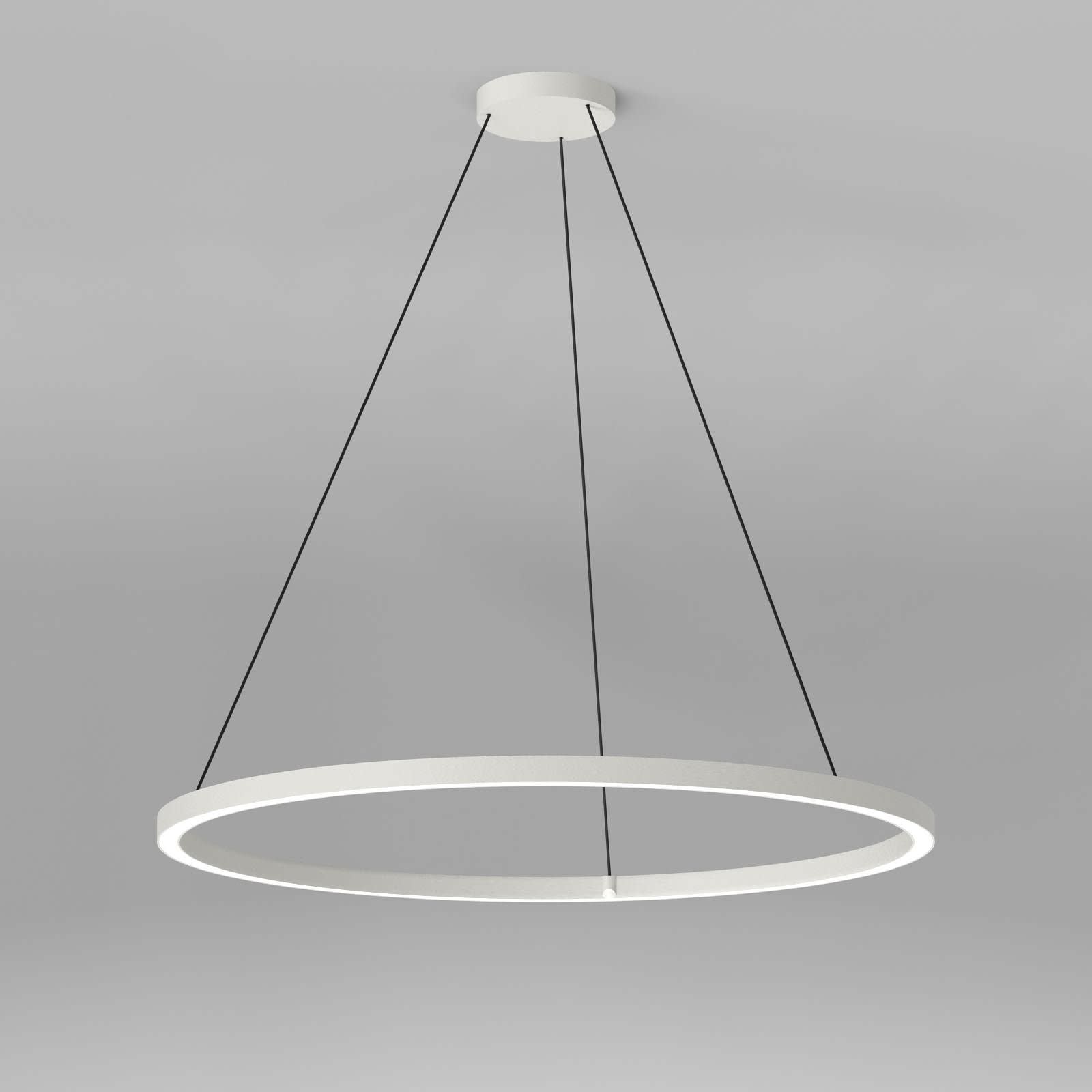 Anneau lumineux LED de grande qualité avec boîtier de luminaire, composé de Aluminium, avec surface thermolaquée en blanc ’RAL9016’, structure fine mate, pour un montage en suspension au centre de la fusion, et pour éclairage direct. Installation par 3 filins de suspension 1500 mm avec tendeurs rapides, avec réglage de la longueur. Raccordement électrique par 5 pôles utilisés et câble d’alimentation noir et patère blanche de plafond, 200x39 mm (DMxH), positionnement centré. Positionnement de la patère au choix centré, suspension centrale de type Z, fusion centrale. Diffuseur en satiné pour un éclairage homogène. Luminaire équipé d’une technologie LED innovante avec une efficacité de 130 lm par W et une flux lumineux sortant de Convertisseur DALI pour gradation inclus, Nombre d’adresses DALI : 1, Evaluation de l'éblouissement selon la classification selon DIN EN 12464-1.2021-11 avec UGR < 28, Indice de rendu des couleurs (IRC) > 90, tolérance chromatique étroite MacAdam 3, Indice de protection IP20, classe de protection I, Groupe de risque RG = 0 selon norme IEC 62471, durée de vie nominale > 60.000 h [selon le décret de l’UE]. Option de commutateur : C, Dimensions DMxH : 1110x035 mm, largeur de la section 54 mm. Poids : 3,4 kg