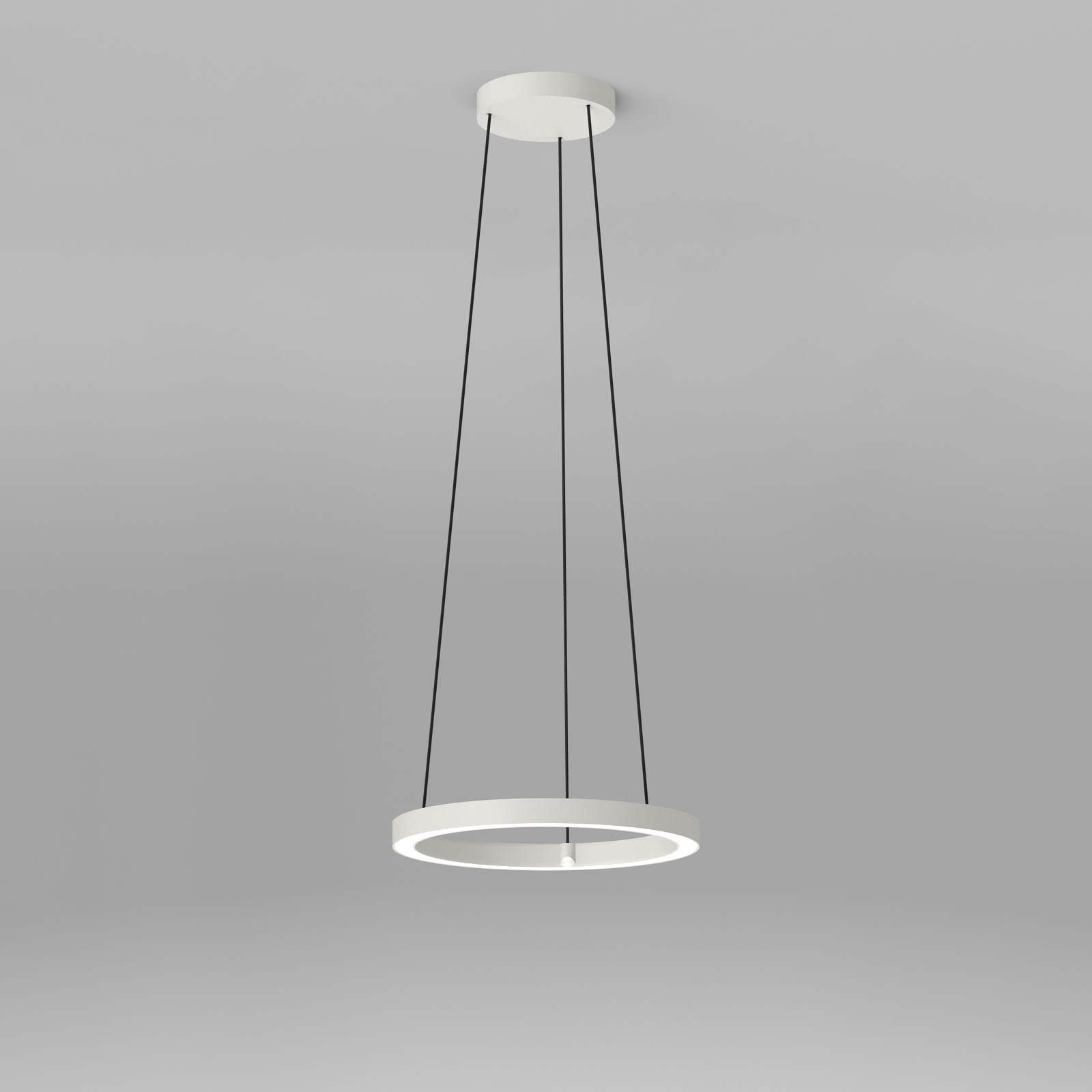 Anneau lumineux LED de grande qualité avec boîtier de luminaire, composé de Aluminium, avec surface thermolaquée en blanc ’RAL9016’, structure fine mate, pour un montage en suspension au centre de la fusion, et pour éclairage direct. Installation par 3 filins de suspension 1500 mm avec tendeurs rapides, avec réglage de la longueur. Raccordement électrique par 5 pôles utilisés et câble d’alimentation noir et patère blanche de plafond, 200x39 mm (DMxH), positionnement centré. Positionnement de la patère au choix centré, suspension centrale de type Z, fusion centrale. Diffuseur en satiné pour un éclairage homogène. Luminaire équipé d’une technologie LED innovante avec une efficacité de 126 lm par W et une flux lumineux sortant de Convertisseur DALI pour gradation inclus, Nombre d’adresses DALI : 1, Evaluation de l'éblouissement selon la classification selon DIN EN 12464-1.2021-11 avec UGR < 28, Indice de rendu des couleurs (IRC) > 90, tolérance chromatique étroite MacAdam 3, Indice de protection IP20, classe de protection I, Groupe de risque RG = 0 selon norme IEC 62471, durée de vie nominale > 60.000 h [selon le décret de l’UE]. Option de commutateur : C, Dimensions DMxH : 0440x035 mm, largeur de la section 54 mm. Poids : 2,0 kg