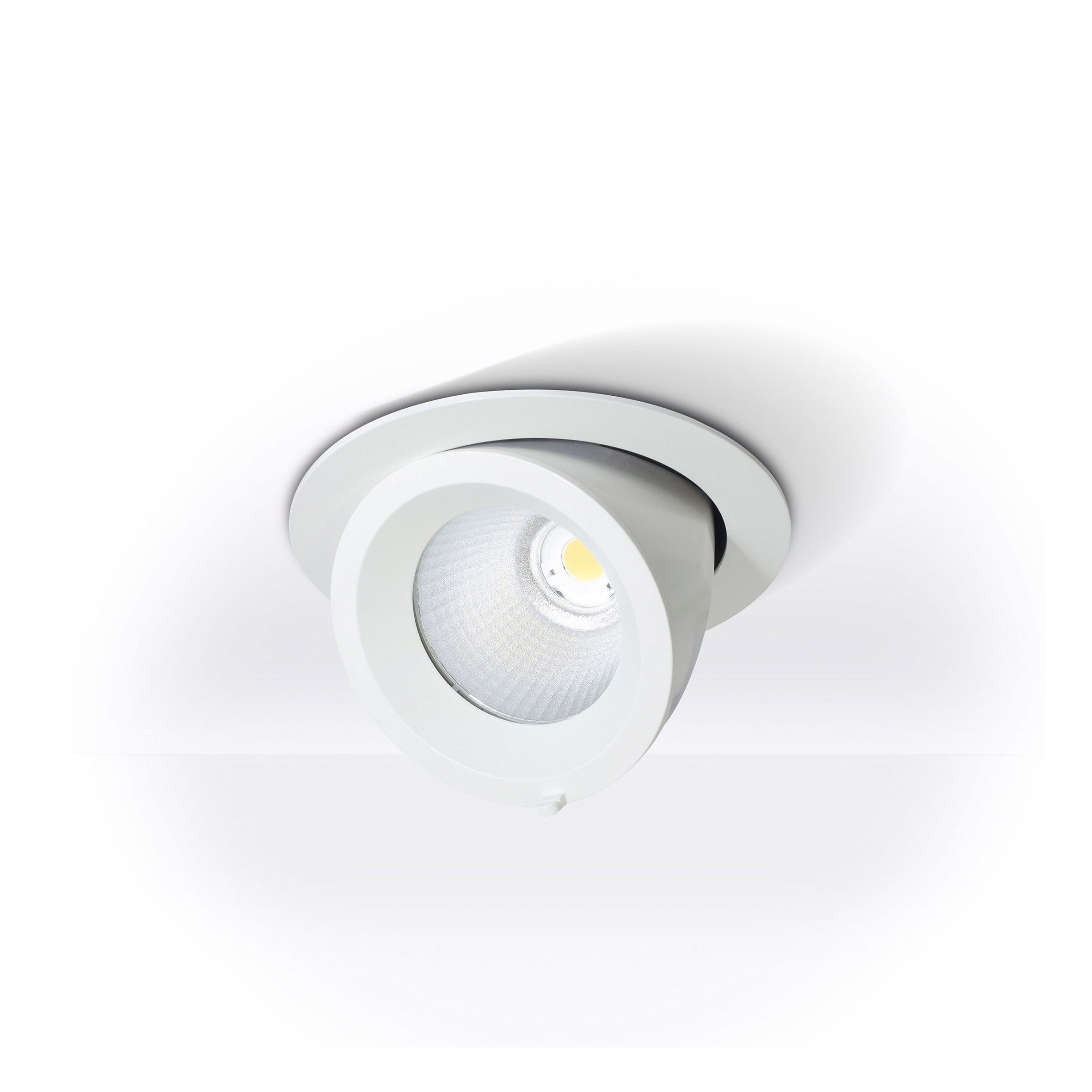 Projecteur encastré LED en aluminium moulé sous pression thermolaqué en revêtu par poudre blanc fine matte. LED technologie innovante avec un flux lumineux sortant de 2344 lm pour 19.5 W, en température de couleur 4000 K. Réflecteur à facettes en aluminium, avec verre de protection. Système optique en retrait pour optimiser l’anti-éblouissement. Caractéristique de rayonnement : un faisceau ’spot’ en 20°. Tête de réflecteur pivotante sur 45° et orientable sur 359°. Projecteur complet incluant réflecteur et convertisseur inclus. Indice de rendu des couleurs (IRC) > 90, Évaluation intégrée de l’éblouissement (UGR) < 16. Durée de vie nominale > 60.000 h [selon le décret de l’UE]. Indice de protection IP20, classe de protection I, Le bouclage sur demande, source lumineuse remplaçable par le fabricant, dispositif de commande remplaçable par un professionnel autorisé, Dimensions : DM : 162 mm, Découpe DMxH : 150x150 mm pour plafonds à 3 mm d’épaisseur, Poids : 0,9 kg