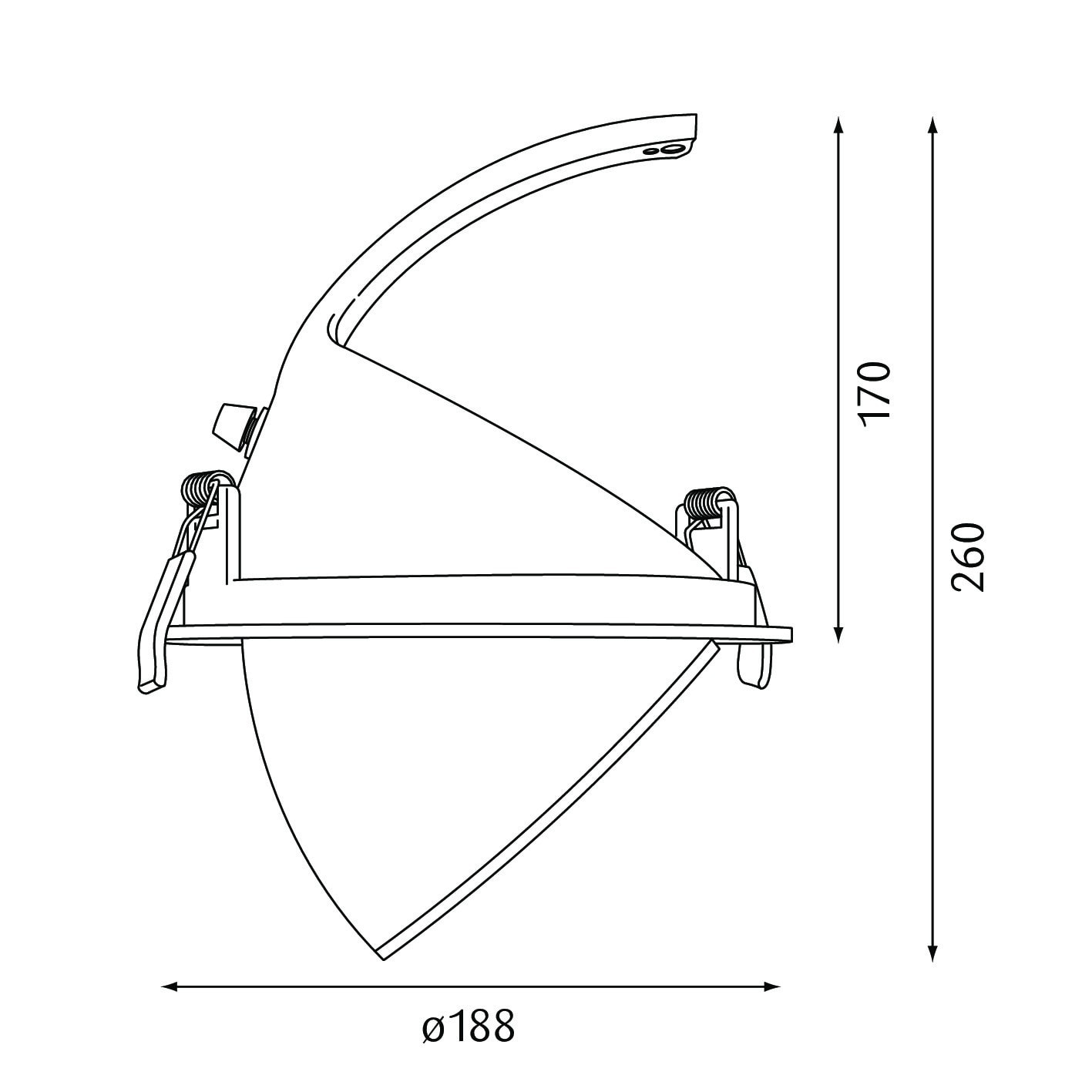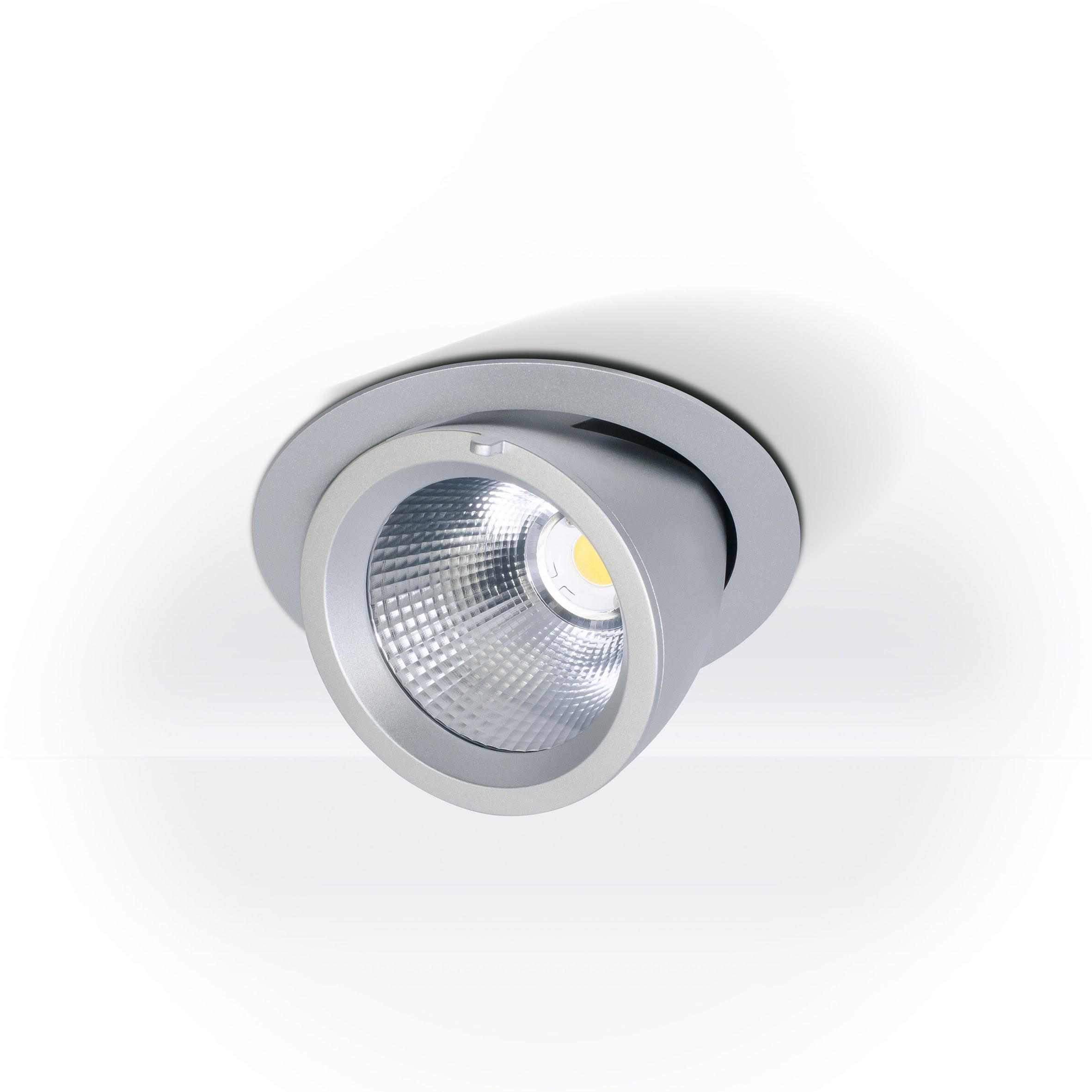 Projecteur encastré LED en aluminium moulé sous pression thermolaqué en revêtu par poudre argent fine matte. Convient pour des épaisseurs de plafond de 3 à 15 mm. LED technologie innovante avec un flux lumineux sortant de 3100 lm pour 23 W, en température de couleur 4000 K. Réflecteur à facettes en aluminium, avec verre de protection. Système optique en retrait pour optimiser l’anti-éblouissement. Caractéristique de rayonnement : un faisceau ’wide flood’ en 60°. Tête de réflecteur pivotante sur 45° et orientable sur 359°. Projecteur complet incluant réflecteur et convertisseur DALI pour gradation. Indice de rendu des couleurs (IRC) > 90, Évaluation intégrée de l’éblouissement (UGR) < 19. Durée de vie nominale > 60.000 h [selon le décret de l’UE]. Indice de protection IP20, classe de protection I, Le bouclage est possible, source lumineuse remplaçable par le fabricant, dispositif de commande remplaçable par un professionnel autorisé, Dimensions : DM : 188 mm, Découpe DMxH : 175x180 mm pour plafonds à 3 mm d’épaisseur, Poids : 1,2 kg