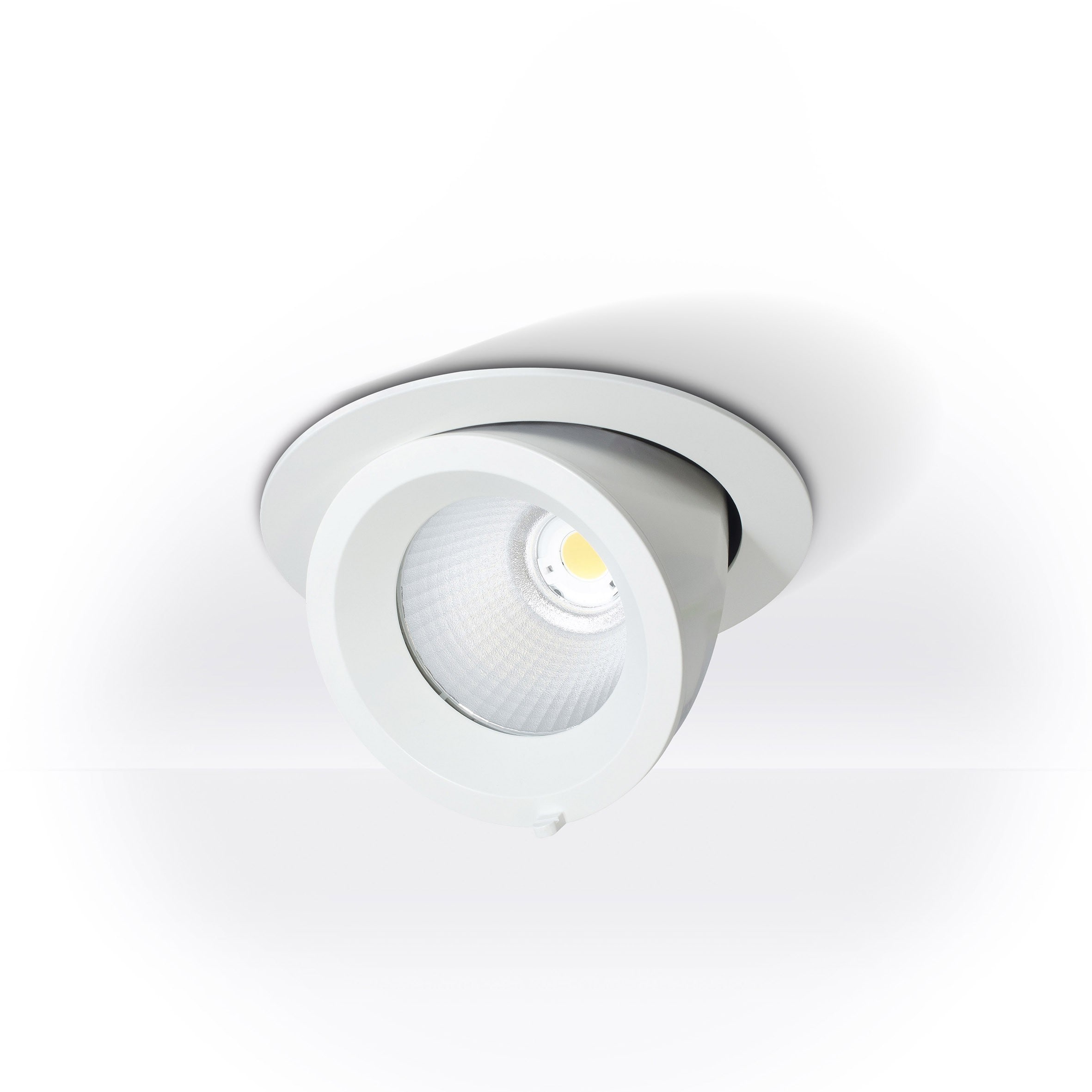 Projecteur encastré LED en aluminium moulé sous pression thermolaqué en revêtu par poudre blanc fine matte. Convient pour des épaisseurs de plafond de 3 à 15 mm. LED technologie innovante avec un flux lumineux sortant de 2960 lm pour 23 W, en température de couleur 3500 K. Réflecteur à facettes en aluminium, avec verre de protection. Système optique en retrait pour optimiser l’anti-éblouissement. Caractéristique de rayonnement : un faisceau ’flood’ en 40°. Tête de réflecteur pivotante sur 45° et orientable sur 359°. Projecteur complet incluant réflecteur et convertisseur inclus. Indice de rendu des couleurs (IRC) > 90, Évaluation intégrée de l’éblouissement (UGR) < 16. Durée de vie nominale > 60.000 h [selon le décret de l’UE]. Indice de protection IP20, classe de protection I, Le bouclage sur demande, source lumineuse remplaçable par le fabricant, dispositif de commande remplaçable par un professionnel autorisé, Dimensions : DM : 188 mm, Découpe DMxH : 175x180 mm pour plafonds à 3 mm d’épaisseur, Poids : 1,2 kg