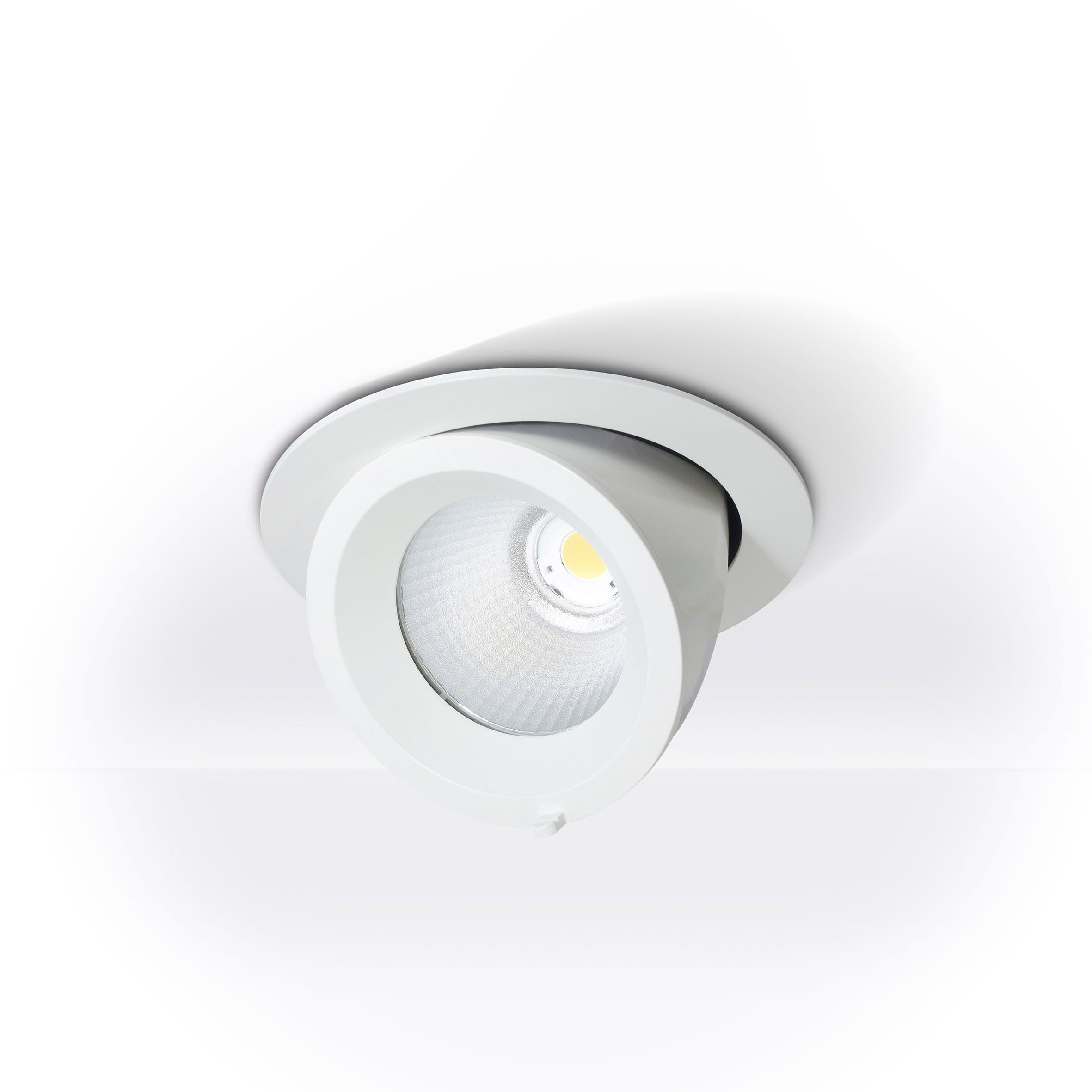 Projecteur encastré LED en aluminium moulé sous pression thermolaqué en revêtu par poudre blanc fine matte. Convient pour des épaisseurs de plafond de 3 à 15 mm. LED technologie innovante avec un flux lumineux sortant de 4029 lm pour 33 W, en température de couleur 3000 K. Réflecteur à facettes en aluminium, avec verre de protection. Système optique en retrait pour optimiser l’anti-éblouissement. Caractéristique de rayonnement : un faisceau ’spot’ en 20°. Tête de réflecteur pivotante sur 45° et orientable sur 359°. Projecteur complet incluant réflecteur et convertisseur inclus. Indice de rendu des couleurs (IRC) > 90, Évaluation intégrée de l’éblouissement (UGR) < 16. Durée de vie nominale > 60.000 h [selon le décret de l’UE]. Indice de protection IP20, classe de protection I, Le bouclage sur demande, source lumineuse remplaçable par le fabricant, dispositif de commande remplaçable par un professionnel autorisé, Dimensions : DM : 188 mm, Découpe DMxH : 175x180 mm pour plafonds à 3 mm d’épaisseur, Poids : 1,2 kg