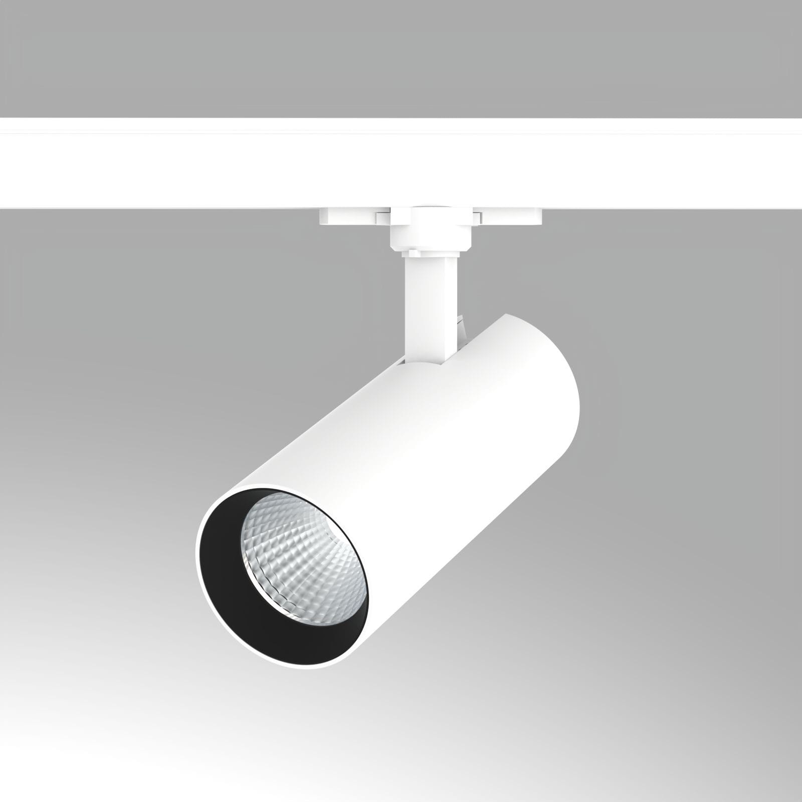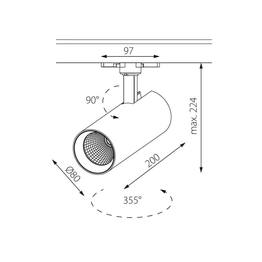 Projecteur LED pour montage apparent sur rail 3 phases, en aluminium moulé sous pression en revêtu par poudre blanc fine matte avec un cône anti-éblouissement 'black matte', optimisé pour l’éclairage d’espaces de vente et d’exposition. Module LED spécial pour l’éclairement optimal de boulangeries. Luminaire équipé d’un module LED avec une efficacité de 57 lm par W et un flux lumineux sortant de 977 lm pour 17 W avec une température de couleur de 2090 K et indice de rendu des couleurs (IRC) > 86, durée de vie nominale > 50.000 h [selon le décret de l’UE], evaluation de l’éblouissement selon la classification selon DIN EN 12464-1.2021-11 avec UGR < 16, luminaire de poste de travail compatible écran selon DIN EN 12464-1 (luminosité à 65° <= 1000 cd/m²), tolérance chromatique étroite MacAdam 3, groupe de risque RG1 selon norme IEC 62471, indice de protection IP20, classe de protection I. Réflecteur à facettes en aluminium. Caractéristique de rayonnement 60°, projecteur pivotant sur 90° et orientable sur 355°, à refroidissement passif, adaptateur DALI Eutrac blanc et convertisseur DALI gradable inclus, en option : grille nid d´abeille, lentille en forme ovale, verre effet flou gaussien, verre de protection transparent. Option de commutateur : C, source lumineuse remplaçable par un professionnel autorisé, dispositif de commande remplaçable par le fabricant, dimensions : LxlxH : 200x80x227 mm, DMxH : 80x227 mm, Poids : 1,4 kg