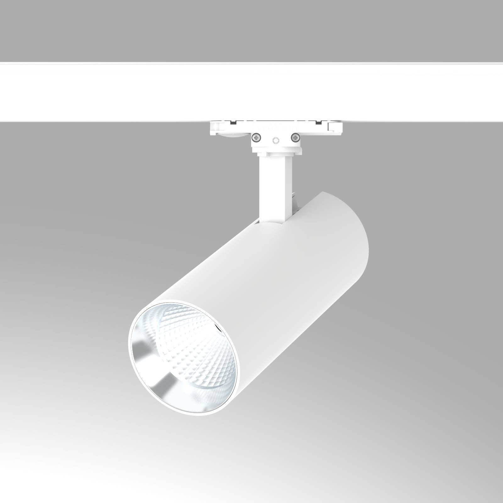 Projecteur LED pour montage apparent sur rail 3 phases, en aluminium moulé sous pression en revêtu par poudre blanc fine matte avec un cône anti-éblouissement 'high-gloss silver', optimisé pour l’éclairage d’espaces de vente et d’exposition. Module LED spécial pour l’éclairement optimal de boucheries. Luminaire équipé d’un module LED avec une efficacité de 58 lm par W et un flux lumineux sortant de 978 lm pour 17 W avec une température de couleur de 1870 K et indice de rendu des couleurs (IRC) > 88, durée de vie nominale > 50.000 h [selon le décret de l’UE], evaluation de l’éblouissement selon la classification selon DIN EN 12464-1.2021-11 avec UGR < 16, luminaire de poste de travail compatible écran selon DIN EN 12464-1 (luminosité à 65° <= 1000 cd/m²), tolérance chromatique étroite MacAdam 3, groupe de risque RG1 selon norme IEC 62471, indice de protection IP20, classe de protection I. Réflecteur à facettes en aluminium. Caractéristique de rayonnement 60°, projecteur pivotant sur 90° et orientable sur 355°, à refroidissement passif, adaptateur DALI Stucchi ONEtrack/Global pulse blanc et convertisseur DALI gradable inclus, en option : grille nid d´abeille, lentille en forme ovale, verre effet flou gaussien, verre de protection transparent. Option de commutateur : C, source lumineuse remplaçable par un professionnel autorisé, dispositif de commande remplaçable par le fabricant, dimensions : LxlxH : 200x80x227 mm, DMxH : 80x227 mm, Poids : 1,4 kg