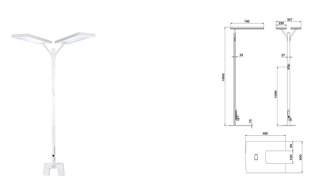 Luminaire LED sur pied ludic touch deporte double 50W simultane 4000K 6864K 137LM/W IRC80 dimmable par bouton poussoir intégré livré monté