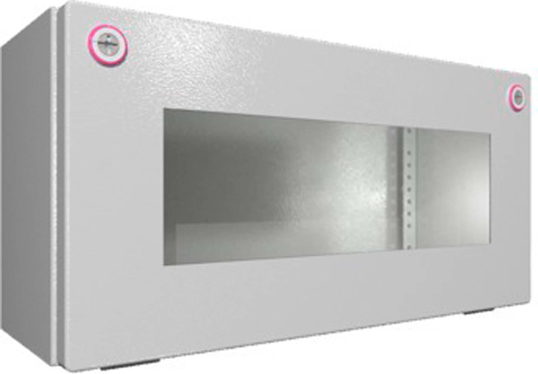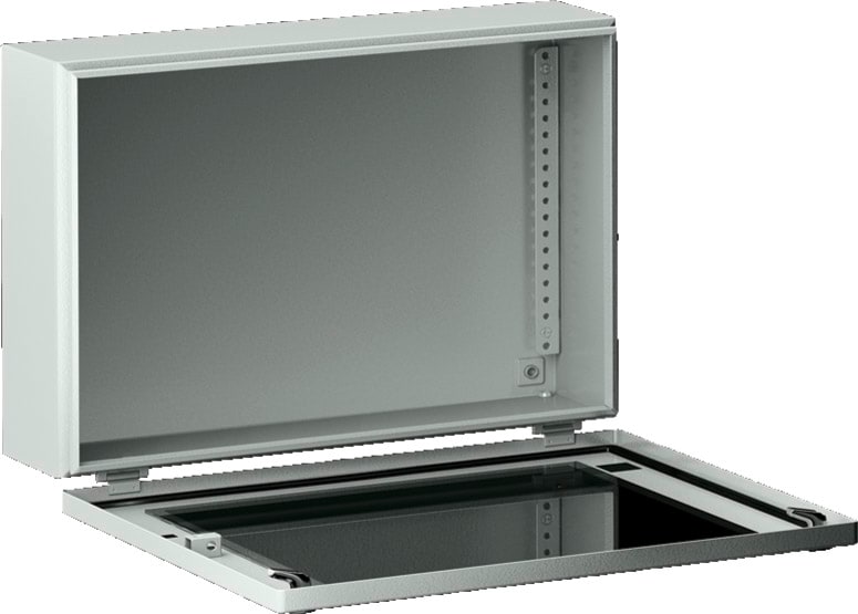 Coffret mural avec porte en tôle d'acier, avec vitre en polycarbonate. Indice de protection IP 65. Au choix avec plaque de montage ou rails porteurs
