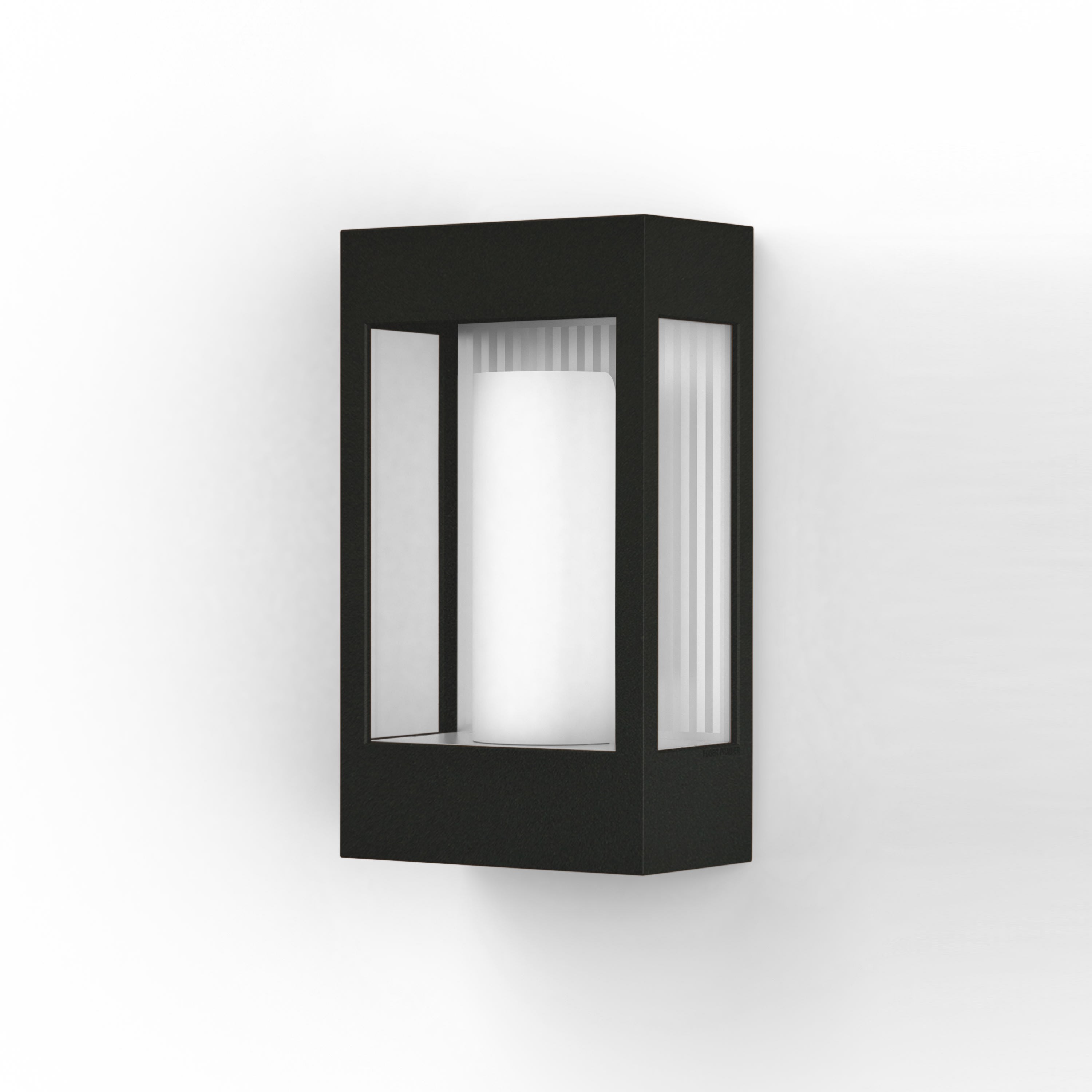 Applique BRICK², en aluminium, E27, IP44, classe 2, vitrage verre clair, diffuseur hémicylindrique satiné. Teinte RAL 7021 Gris noir 107. Garantie 25 ans anticorrosion sur l'aluminium