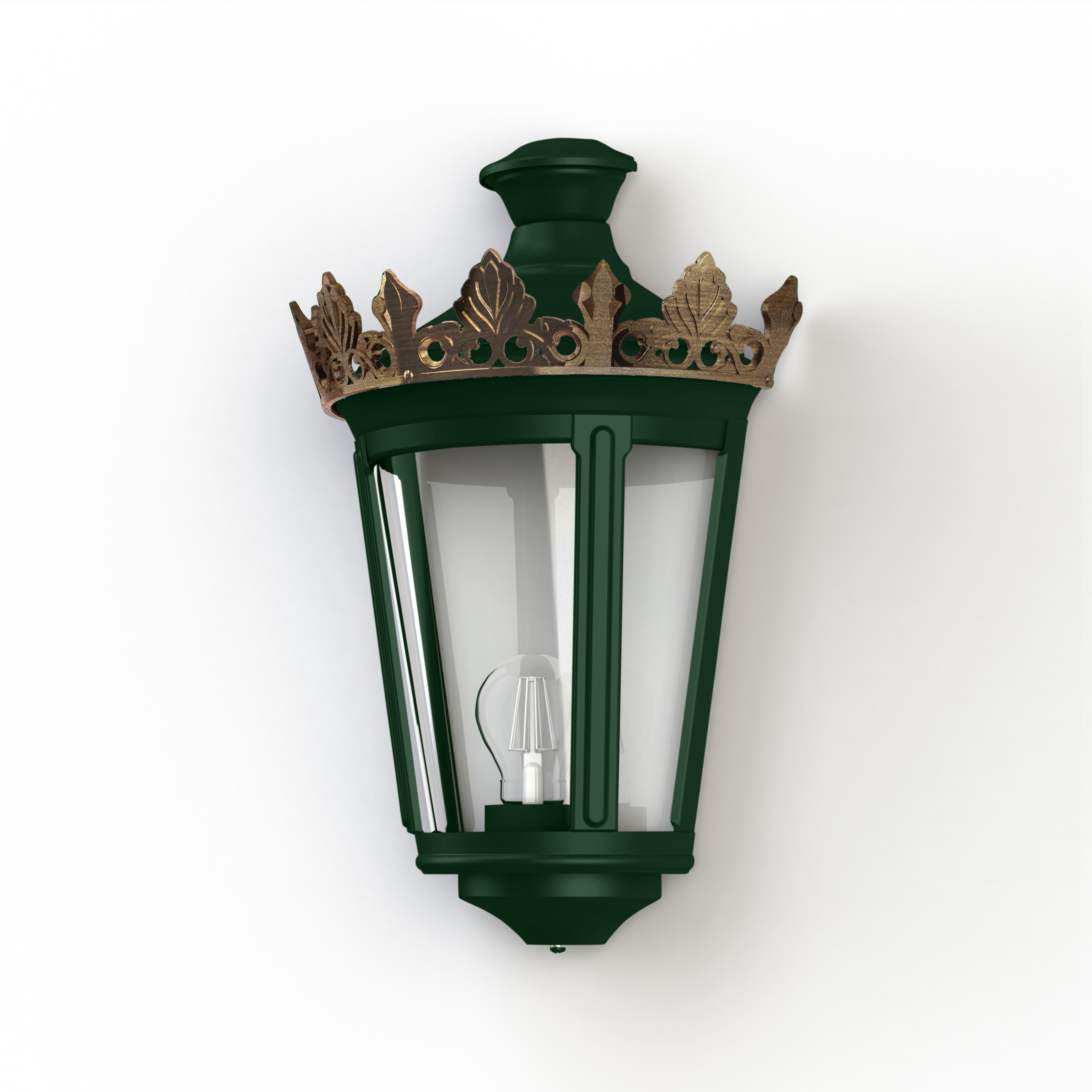 Applique LOUVRE en aluminium, E27, IP44, classe 1, diffuseur verre clair soufflé. Teinte RAL 6009 Vert sapin 067, couronne dorée. Garantie 25 ans anticorrosion sur l'aluminium