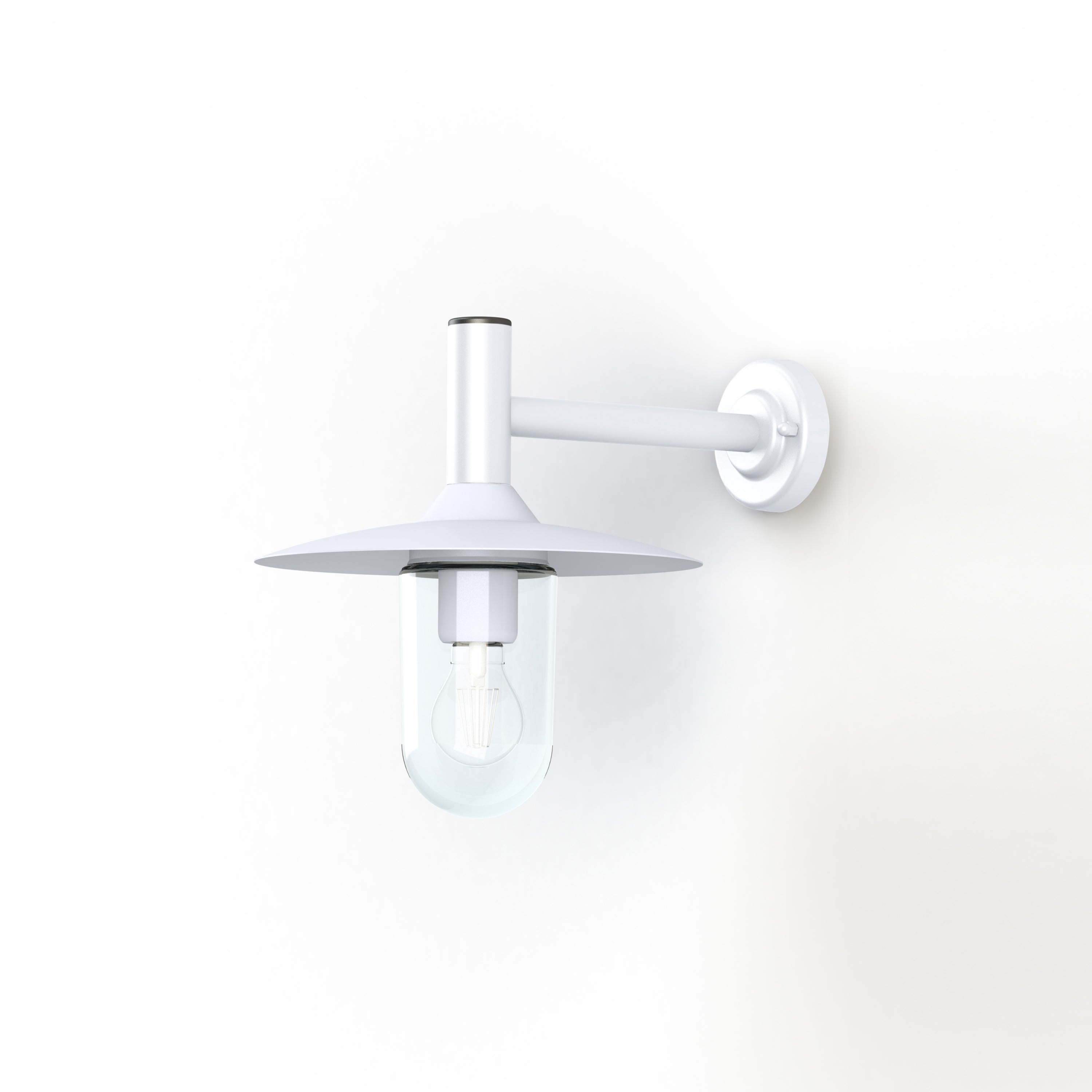 Applique descendante MONTANA en aluminium, E27, IP44, classe 1, diffuseur verre clair. Potence Teinte Blanc 001, dôme blanc. Garantie 25 ans anticorrosion sur l'aluminium