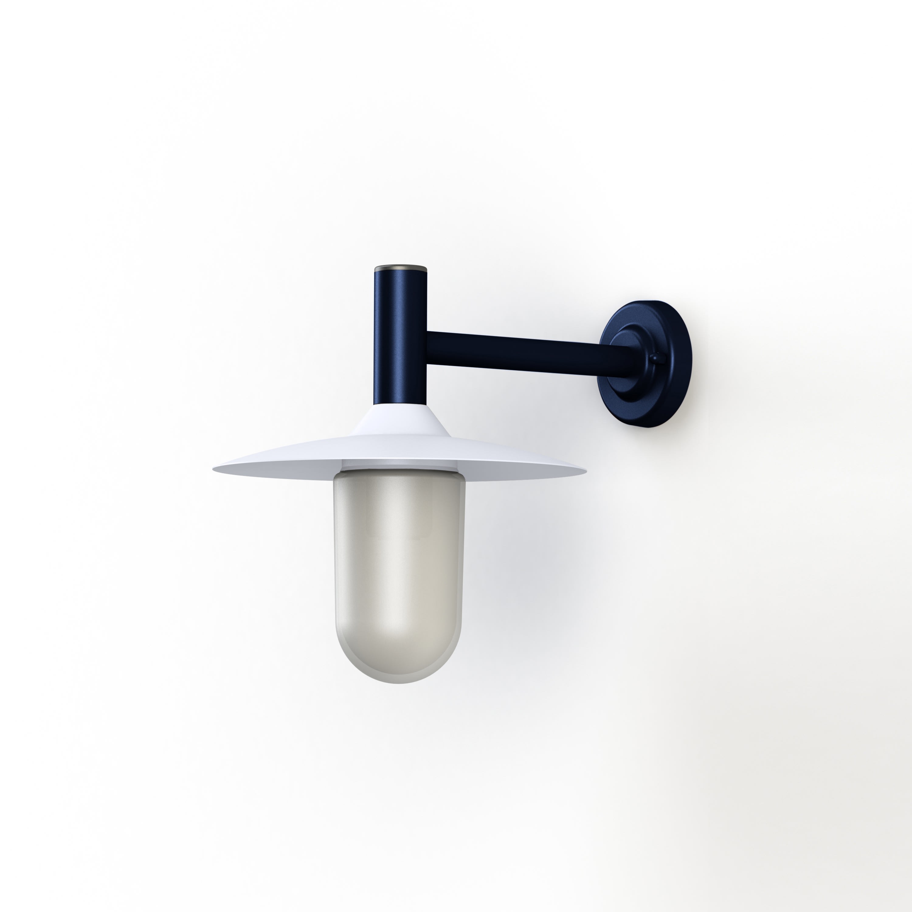 Applique descendante MONTANA en aluminium, E27, IP44, classe 1, diffuseur verre dépoli. Potence Teinte RAL 5011 Bleu acier 065, dôme blanc. Garantie 25 ans anticorrosion sur l'aluminium
