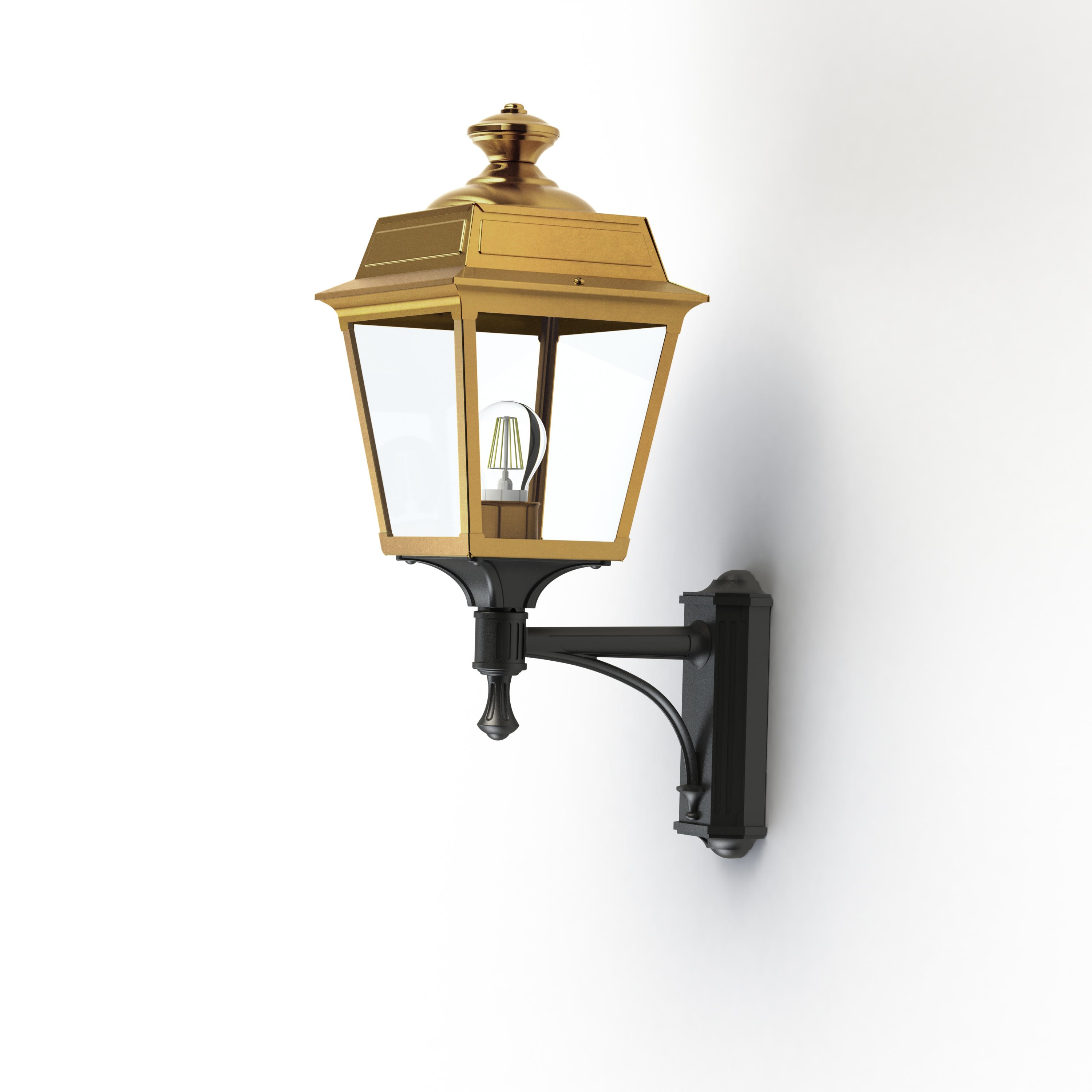 Applique montante PLACE DES VOSGES TRADITION, E27, IP44, classe 1, diffuseurs verre clair. Matière lanterne : laiton vernis teinté 070. Matière potence : aluminium, teinte RAL 9005 noir foncé 000