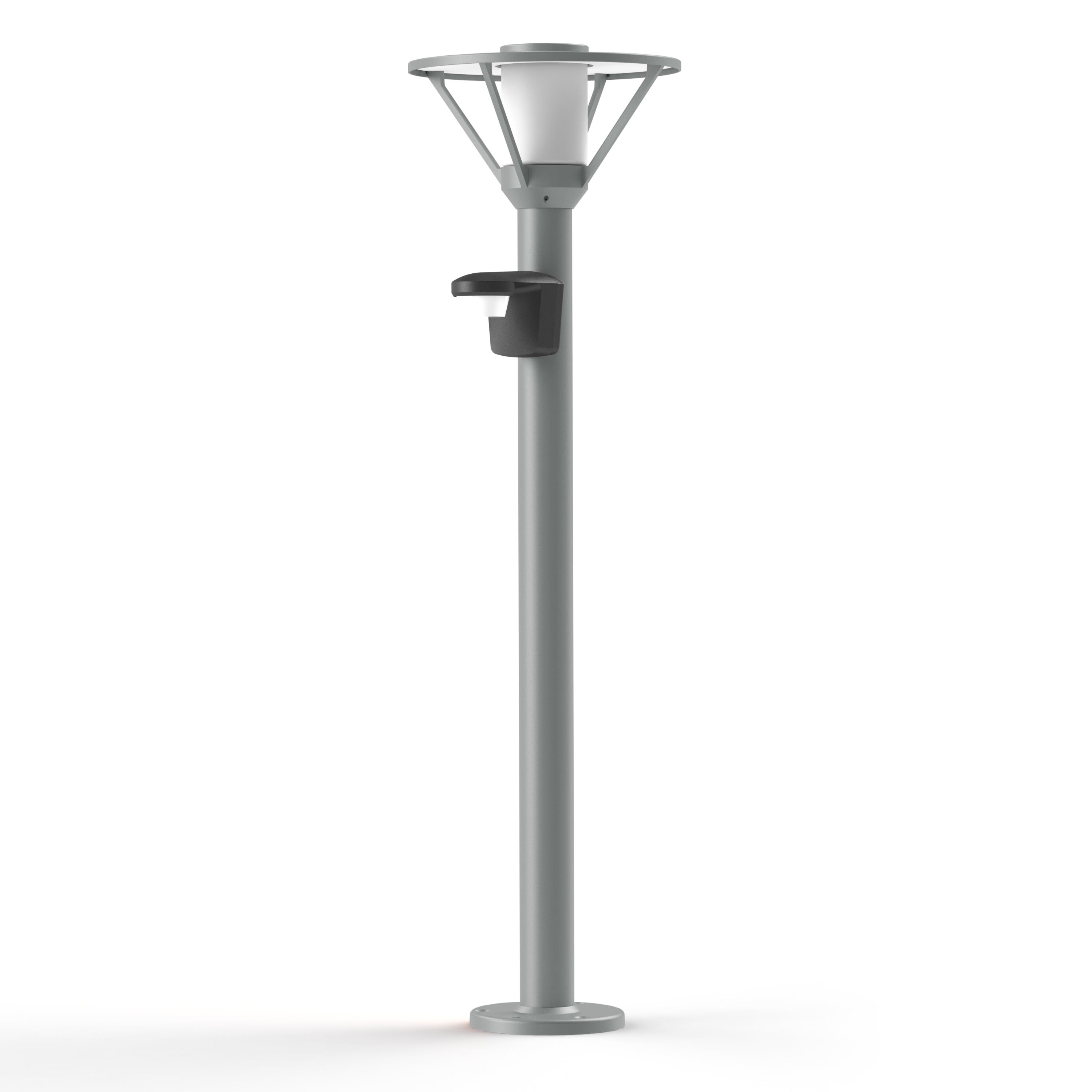 Borne BERMUDE, IP44, classe 1, hauteur 1100mm à détection, en aluminium, E27, réflecteur aluminium blanc, diffuseur verre dépoli. Teinte RAL 7044 Gris soie 105. Garantie 25 ans anticorrosion sur l'aluminium