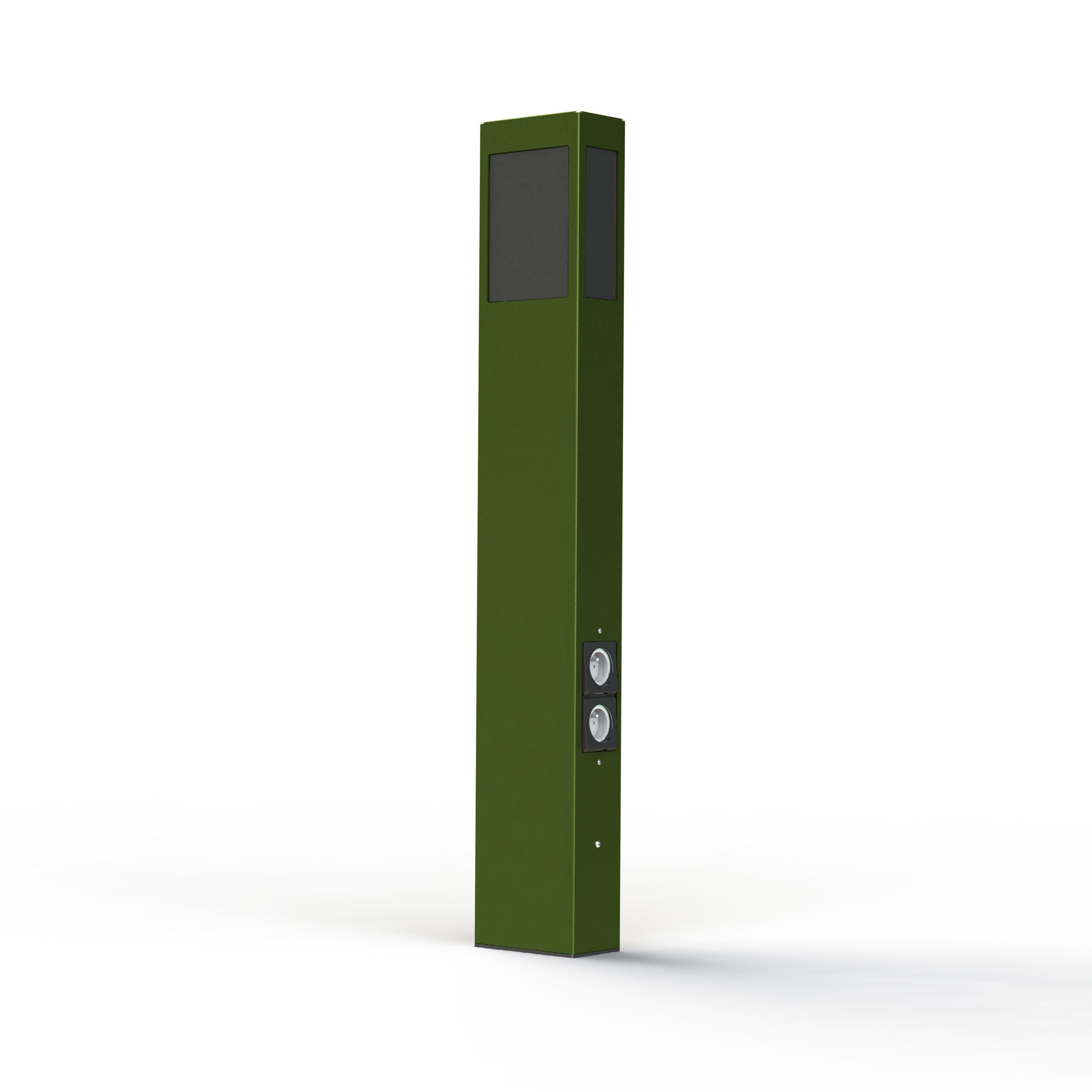 Borne BRICK² hauteur 1100mm avec 2 prises FR, en aluminium, E27, IP44, classe 2, vitrage PMMA noir. Teinte RAL 6025 Vert fougère 109. Garantie 25 ans anticorrosion sur l'aluminium