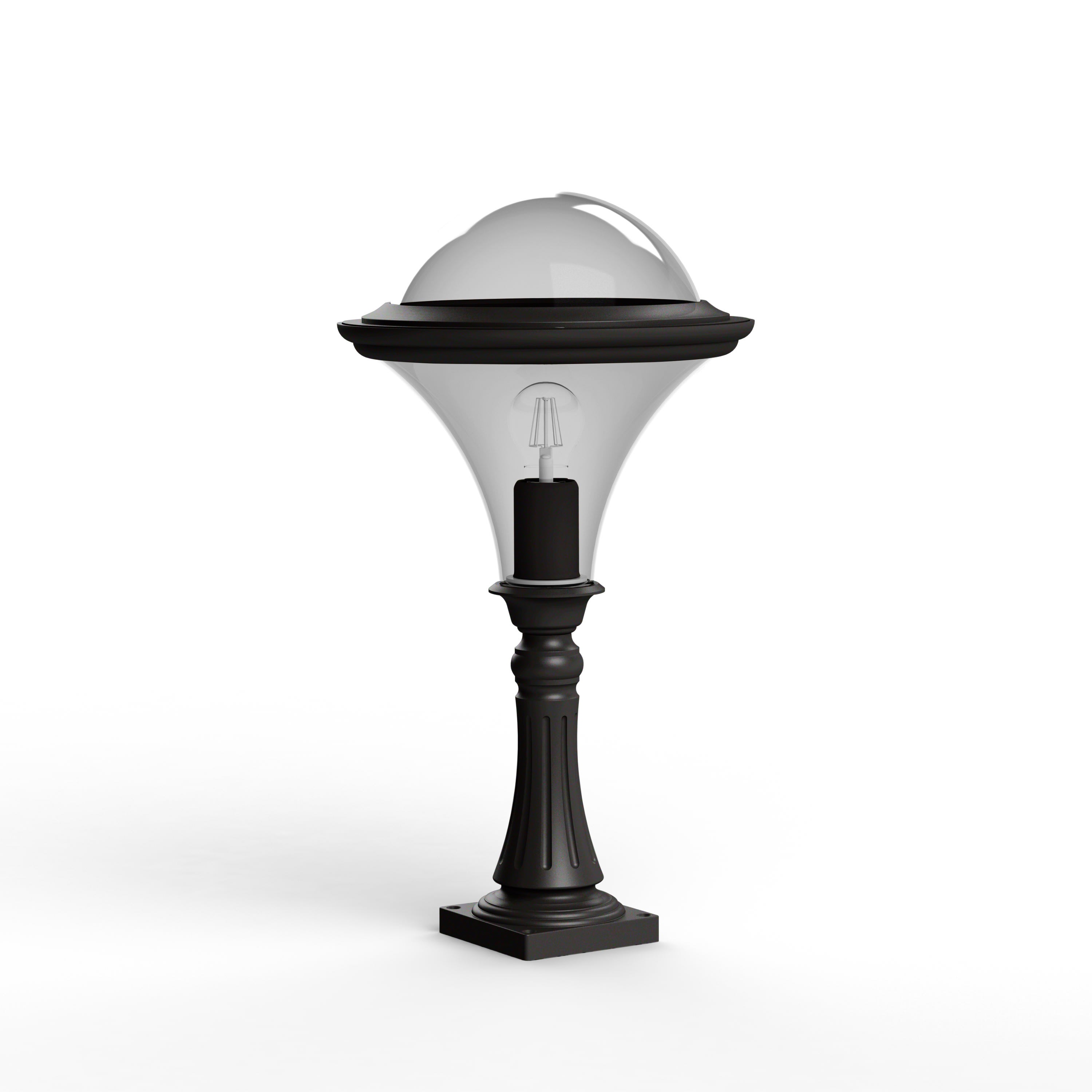 Borne DALLAS en aluminium, E27, IP44, IK10, classe 1, hauteur 581mm, diffuseur polycarbonate fumé. Teinte RAL 9005 Noir foncé 000. Garantie 25 ans anticorrosion sur l'aluminium