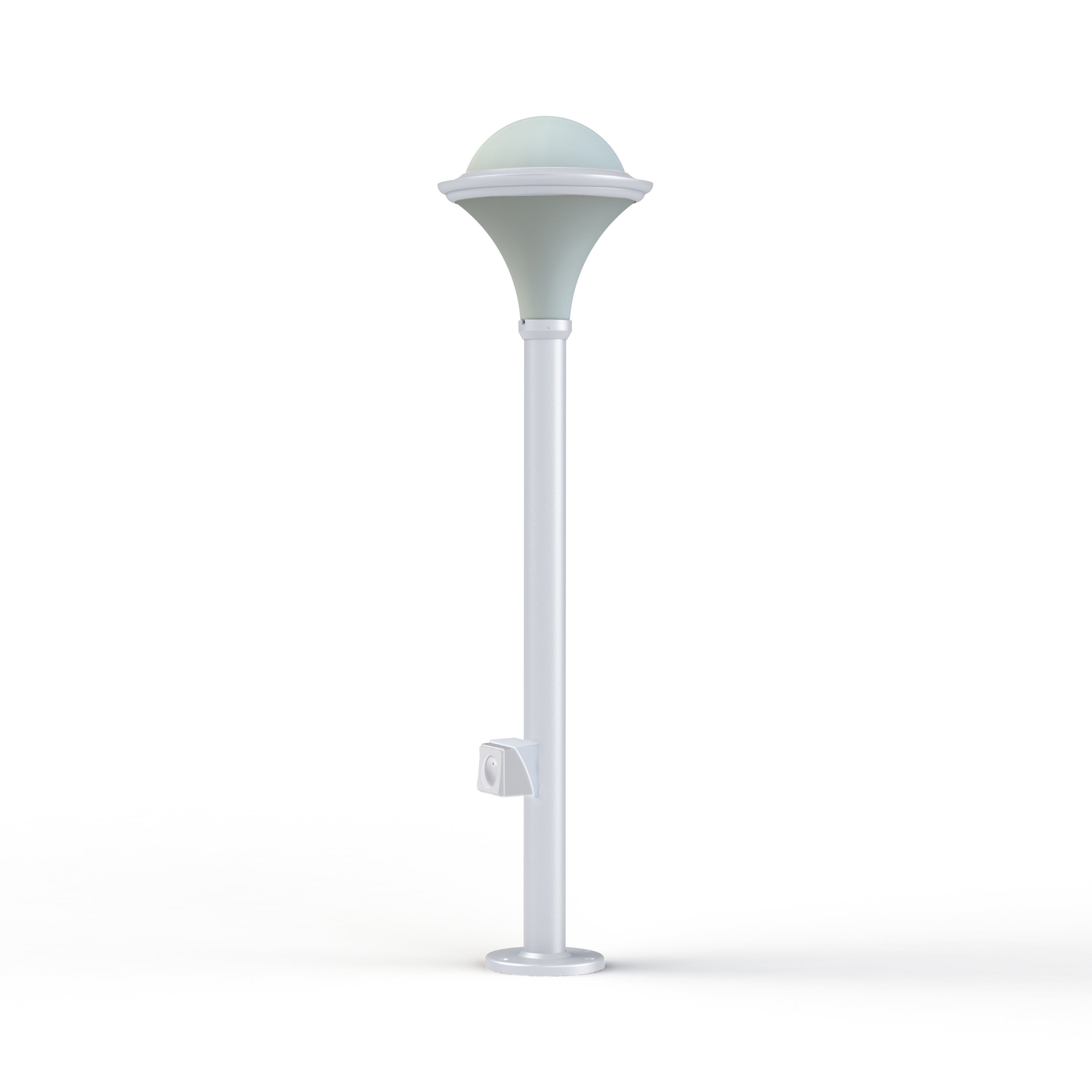 Borne avec prise DALLAS en aluminium, E27, IP44, IK10, classe 1, hauteur 1266mm, diffuseur polycarbonate opale. Teinte Blanc 001. Garantie 25 ans anticorrosion sur l'aluminium