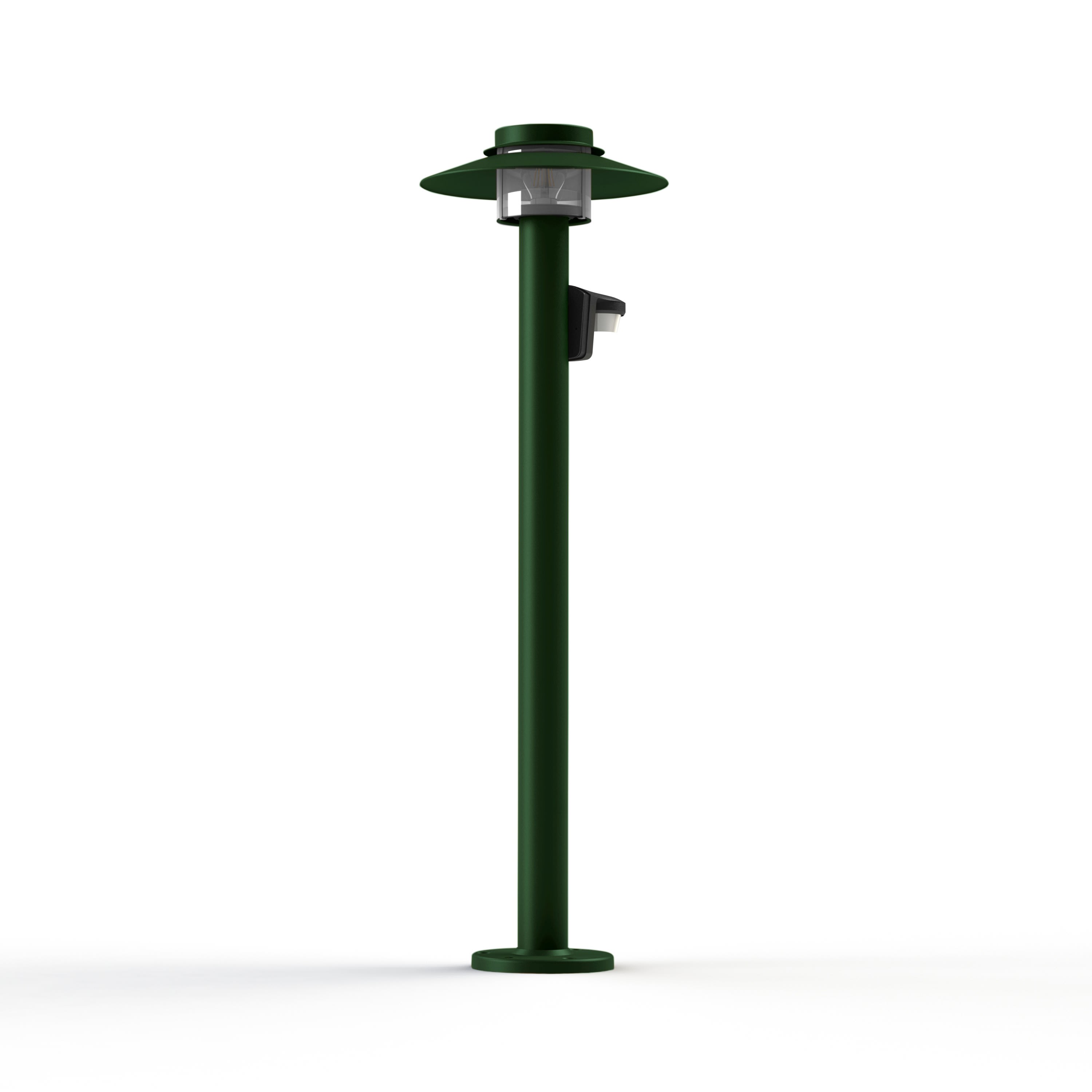 Borne KERLOUAN en aluminium, avec détection, hauteur 1060mm, E27, IP44, classe 1, diffuseur polycarbonate clair. Teinte RAL 6009 Vert anglais 019. Garantie 25 ans anticorrosion sur l'aluminium