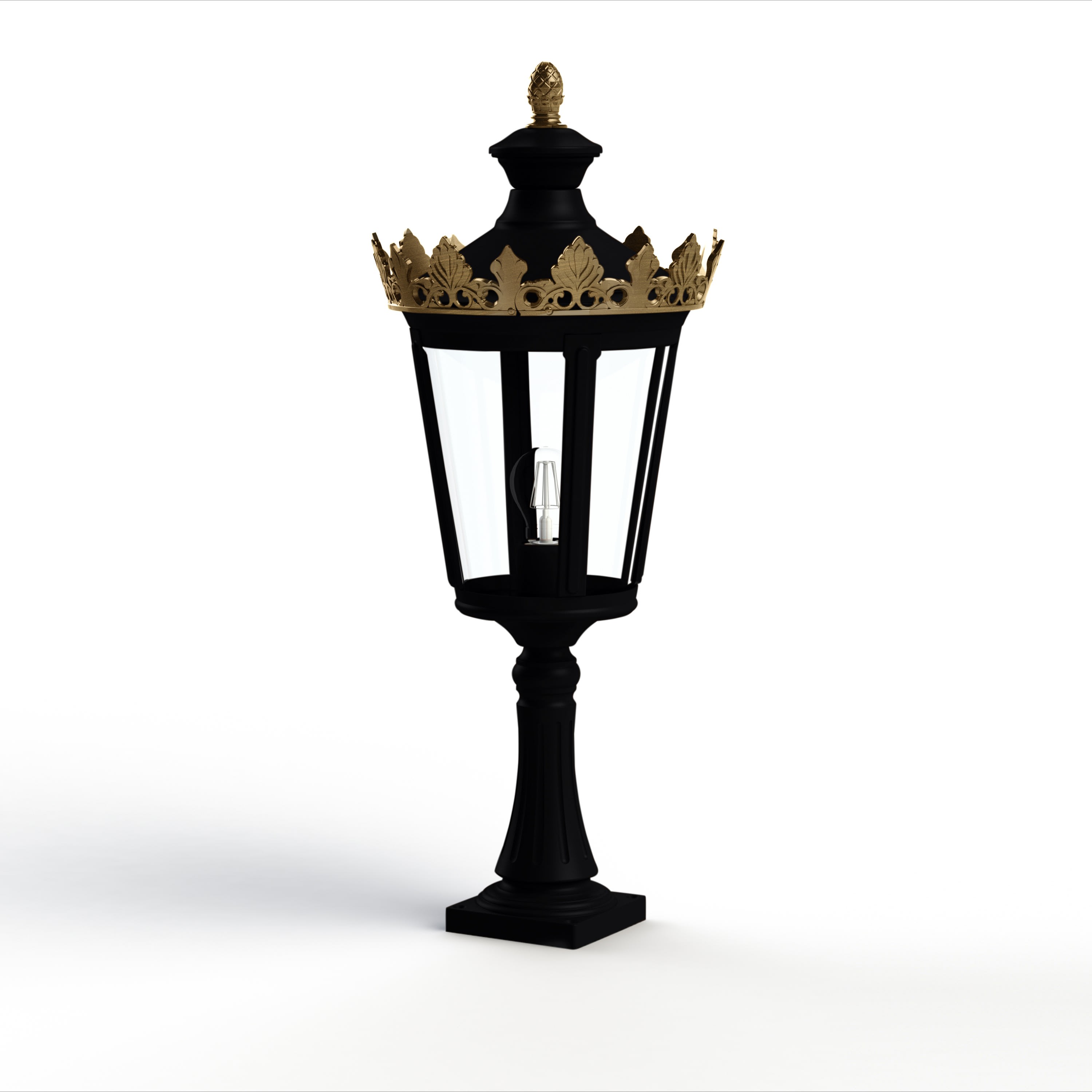 Borne LOUVRE en aluminium, hauteur 730mm, E27, IP44, classe 1, diffuseur verre clair soufflé. Teinte RAL 9005 Noir foncé 000, couronne dorée. Garantie 25 ans anticorrosion sur l'aluminium
