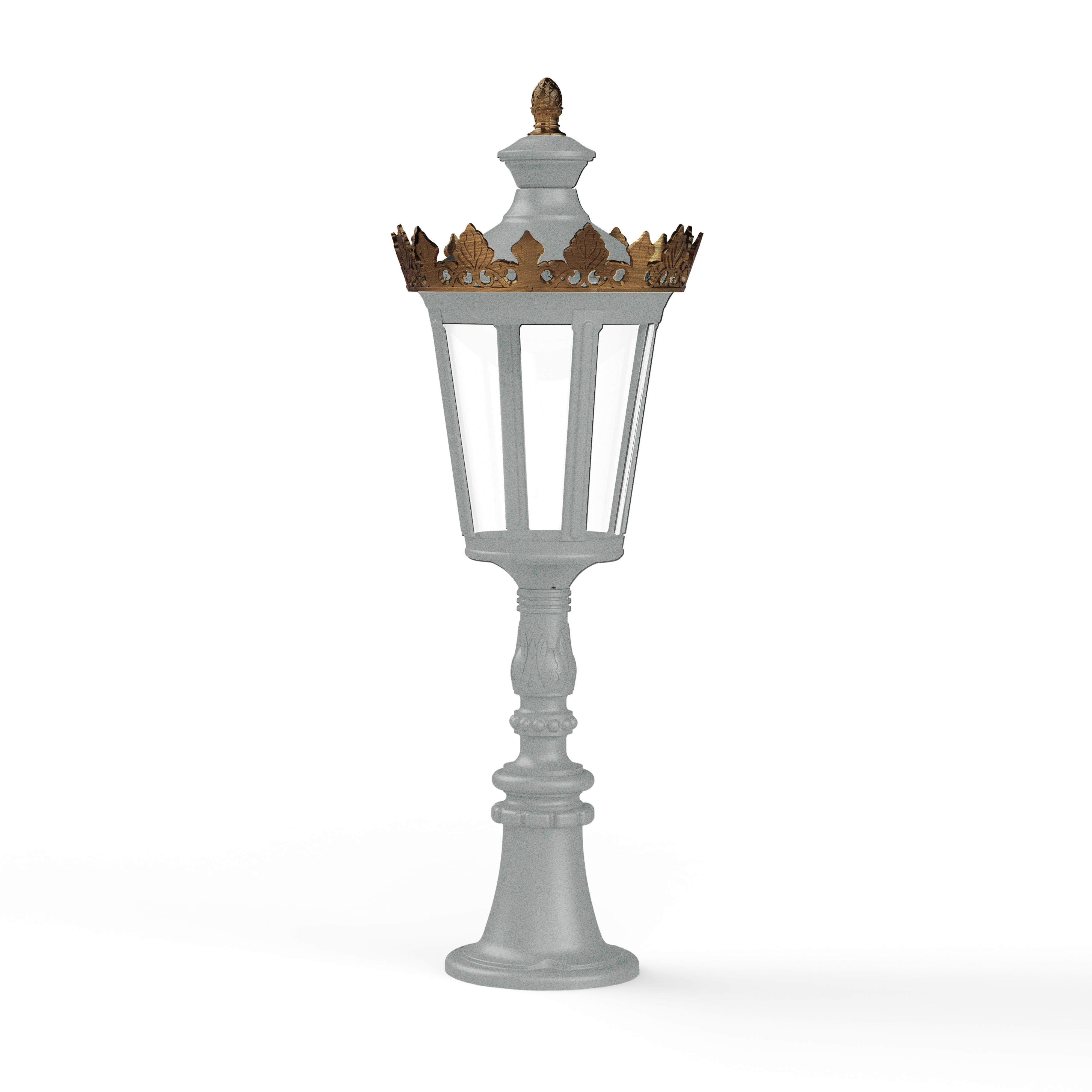 Borne LOUVRE en aluminium, hauteur 860mm, LED 13W 2700°K, IP44, classe 1, diffuseur verre clair soufflé. Teinte RAL 7044 Gris soie 105, couronne dorée. Garantie 25 ans anticorrosion sur l'aluminium