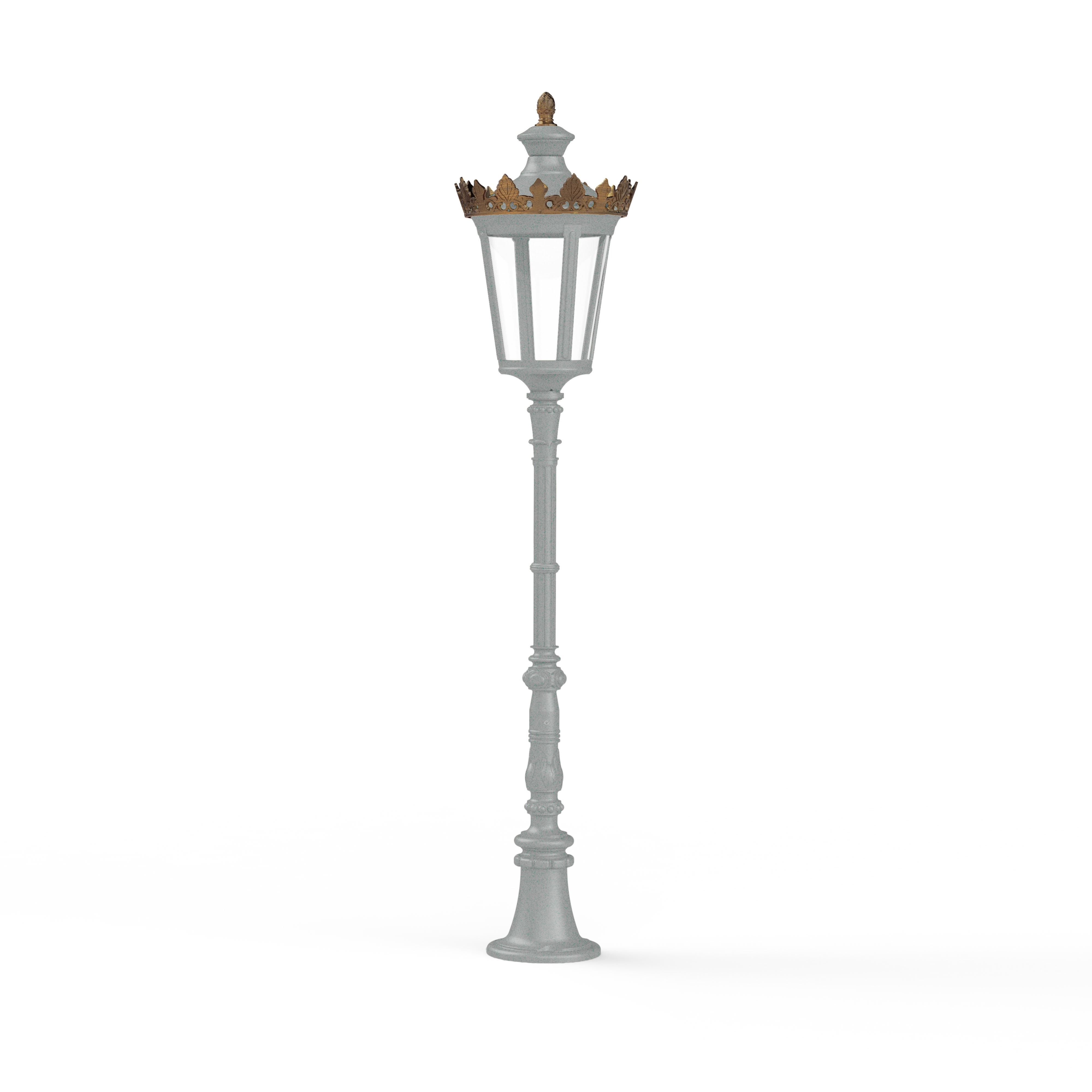 Borne LOUVRE en aluminium, hauteur 1404mm, LED 13W 2700°K, IP44, classe 1, diffuseur verre clair soufflé. Teinte RAL 7044 Gris soie 105, couronne dorée. Garantie 25 ans anticorrosion sur l'aluminium