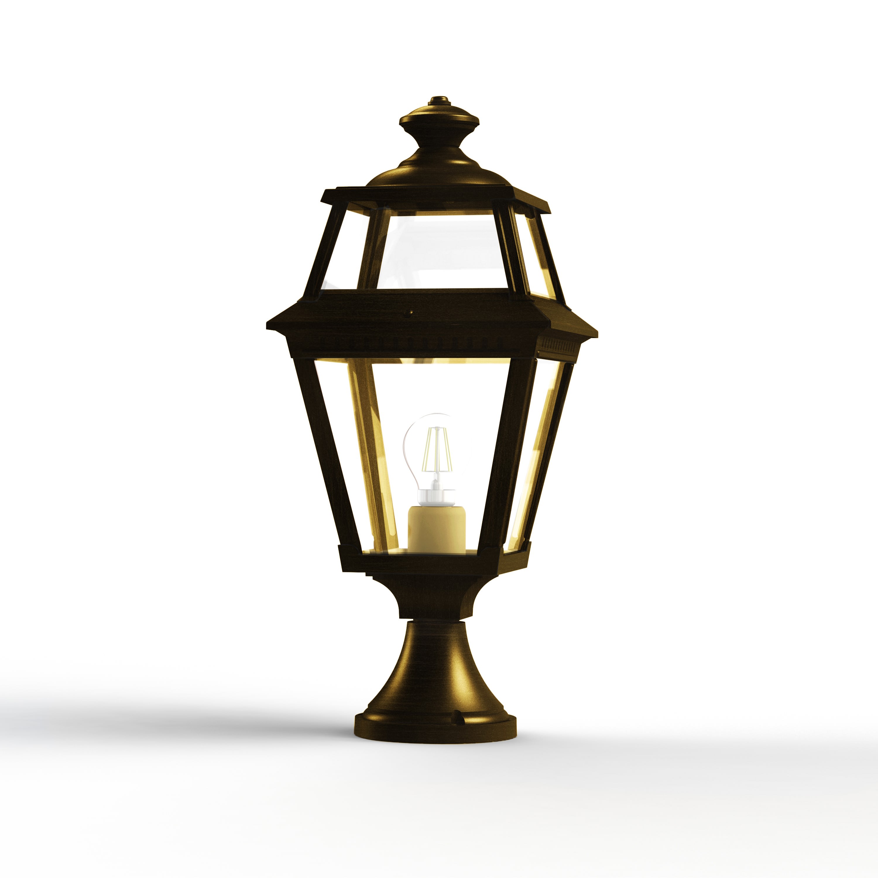 Borne PLACE DES VOSGES 2 en aluminium, hauteur 550mm, E27, IP44, classe 1, diffuseurs verre clair. Finition Patine dorée 009. Garantie 25 ans anticorrosion sur l'aluminium