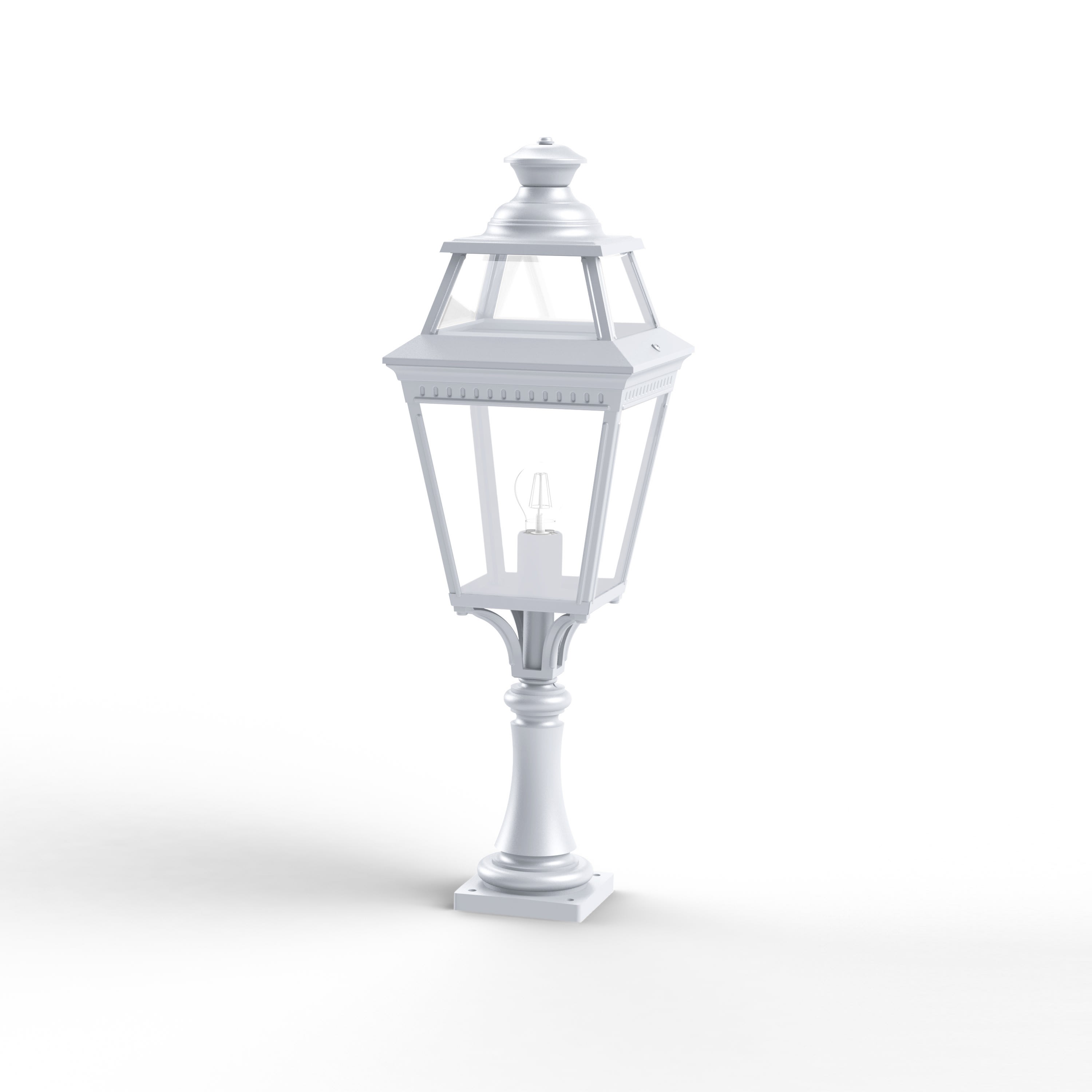 Borne PLACE DES VOSGES 3 en aluminium, hauteur 880mm, E27, IP44, classe 1, diffuseurs verre clair. Teinte Blanc 001. Garantie 25 ans anticorrosion sur l'aluminium