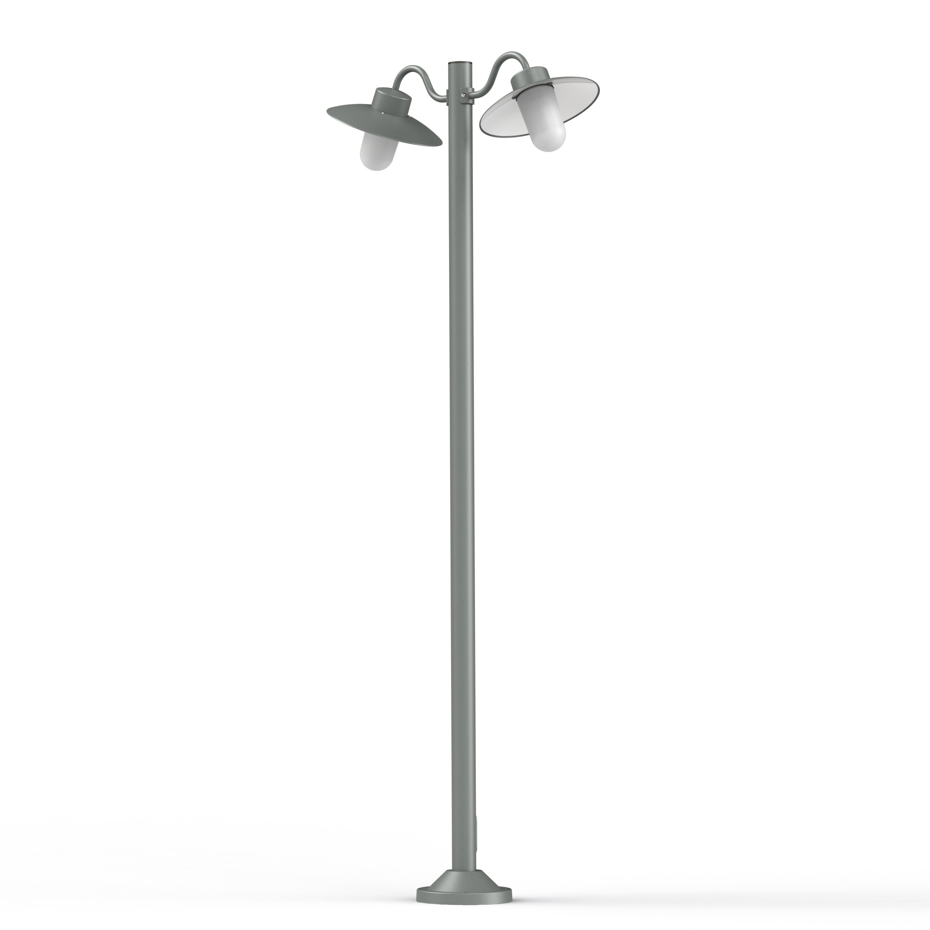 Lampadaire BELCOUR 2 têtes en aluminium, E27, IP44, classe 1, diffuseur verre dépoli. Réflecteurs blanc. Teinte Gris métal 023. Garantie 25 ans anticorrosion sur l'aluminium