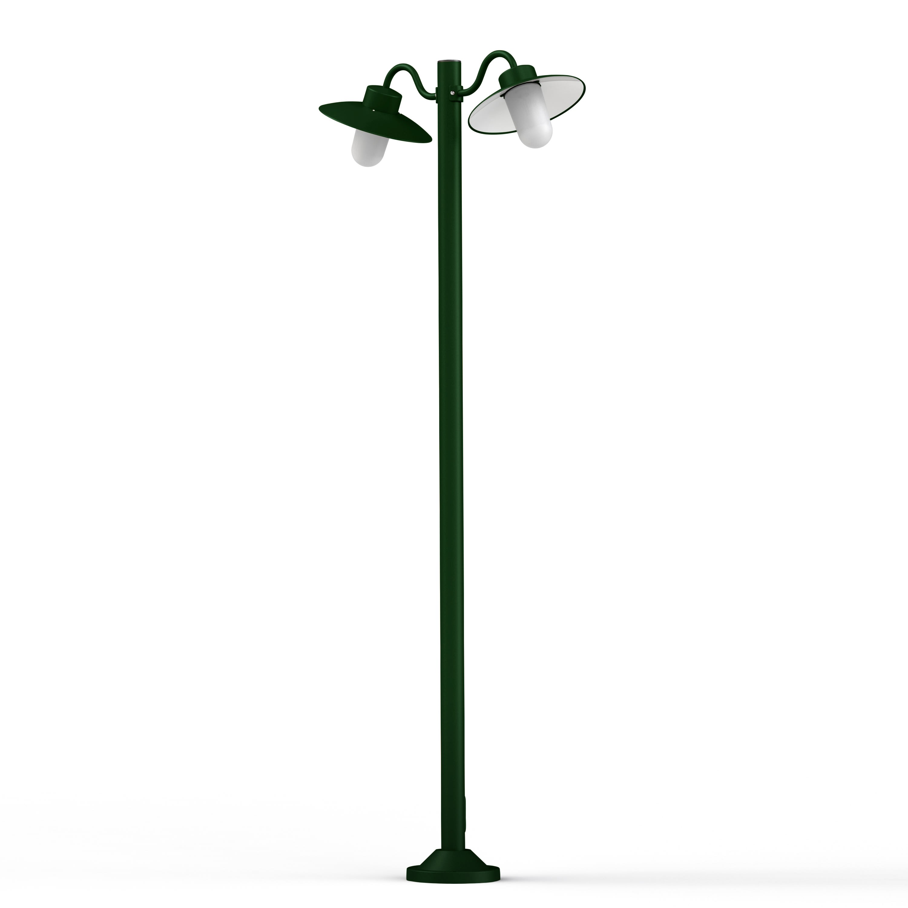 Lampadaire BELCOUR 2 têtes en aluminium, E27, IP44, classe 1, diffuseur verre dépoli. Réflecteurs blanc. Teinte RAL 6009 Vert anglais 019. Garantie 25 ans anticorrosion sur l'aluminium