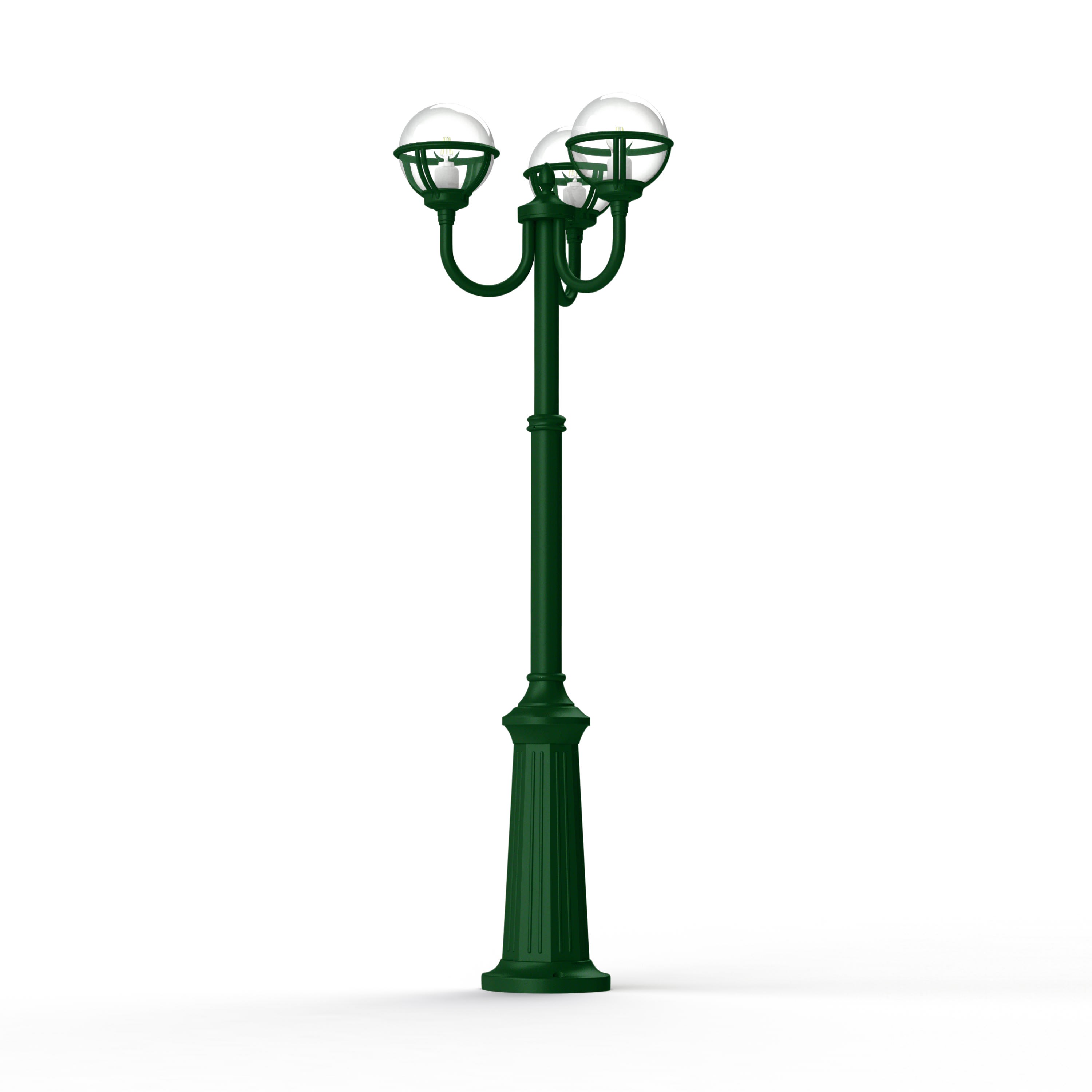 Lampadaire 3 têtes BOREAL, E27, IP44, IK08, classe 1, en aluminium globes Ø200 méthacrylate fumé. Teinte RAL 6009 Vert sapin 067. Garantie 25 ans anticorrosion sur l'aluminium