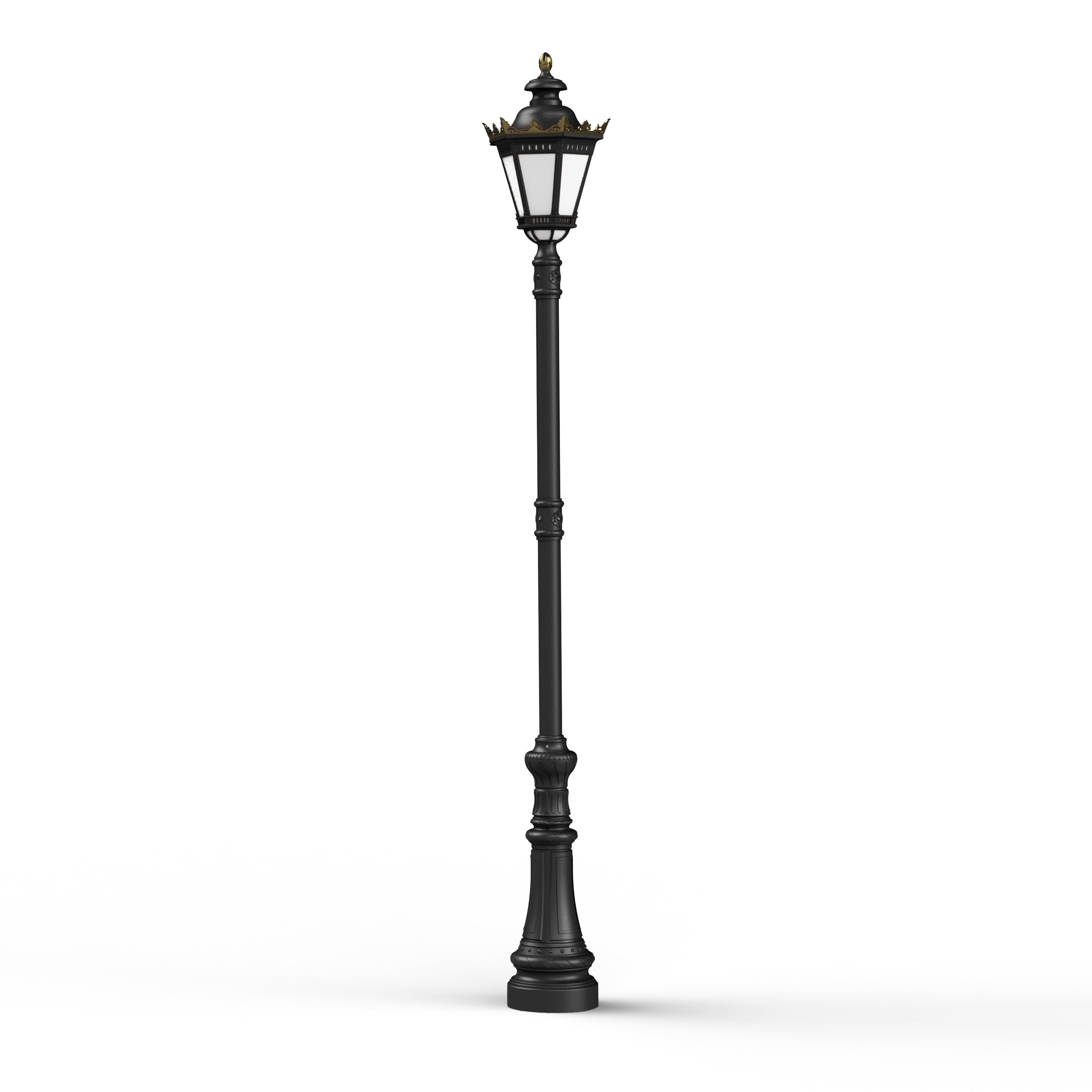 Lampadaire 1 tête CITADELLE avec couronne, en aluminium, LED 35W 3000°K, IP66, classe 1, vasque méthacrylate opale. Teinte RAL 9005 Noir foncé 000. Garantie 25 ans anticorrosion sur l'aluminium