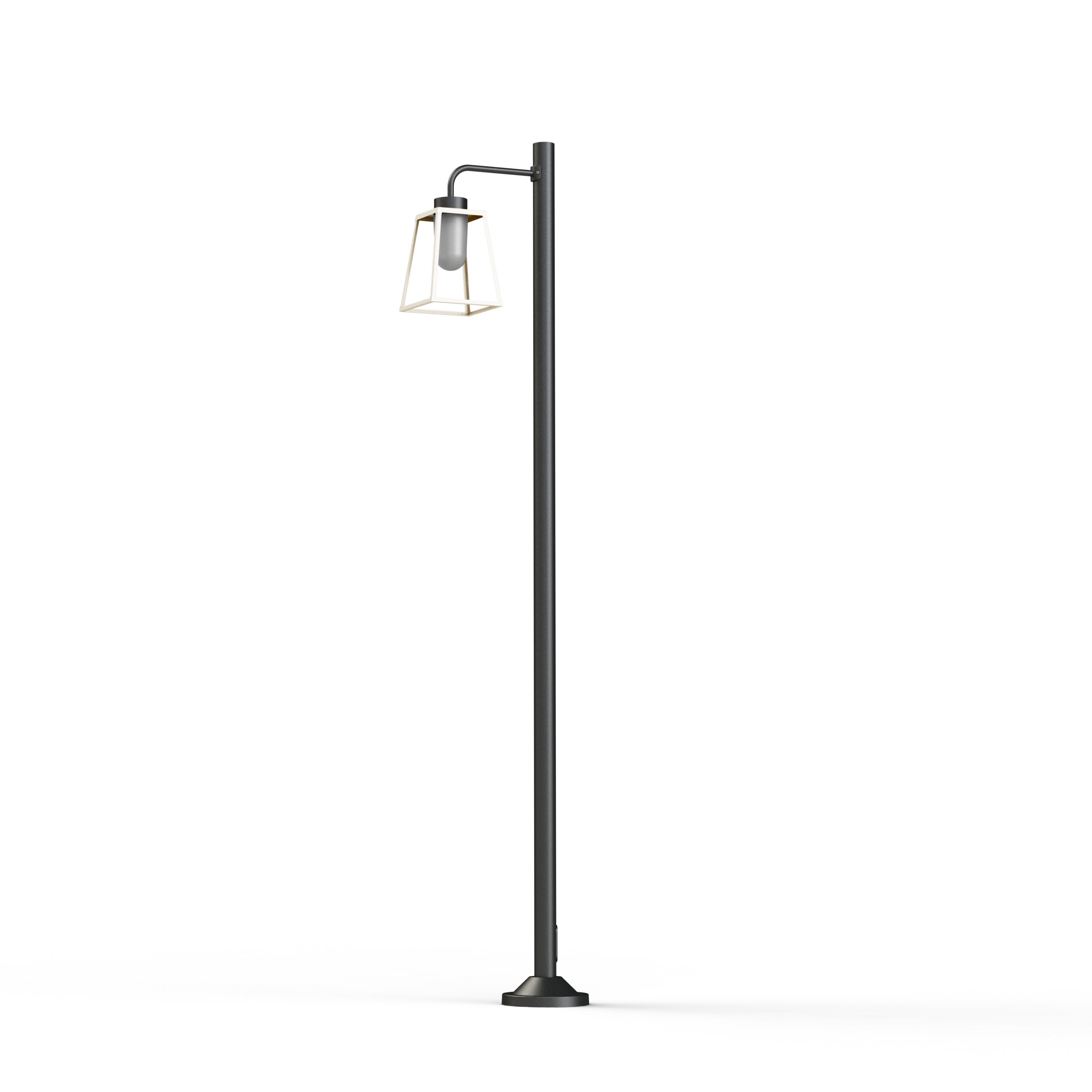 Lampadaire 1 tête LAMPIOK 1 en aluminium, E27, IP65, classe 2, diffuseur verre dépoli. Cage : teinte Blanc 001. Mât, bras : teinte RAL 7021 Gris noir 107. Garantie 25 ans anticorrosion sur l'aluminium