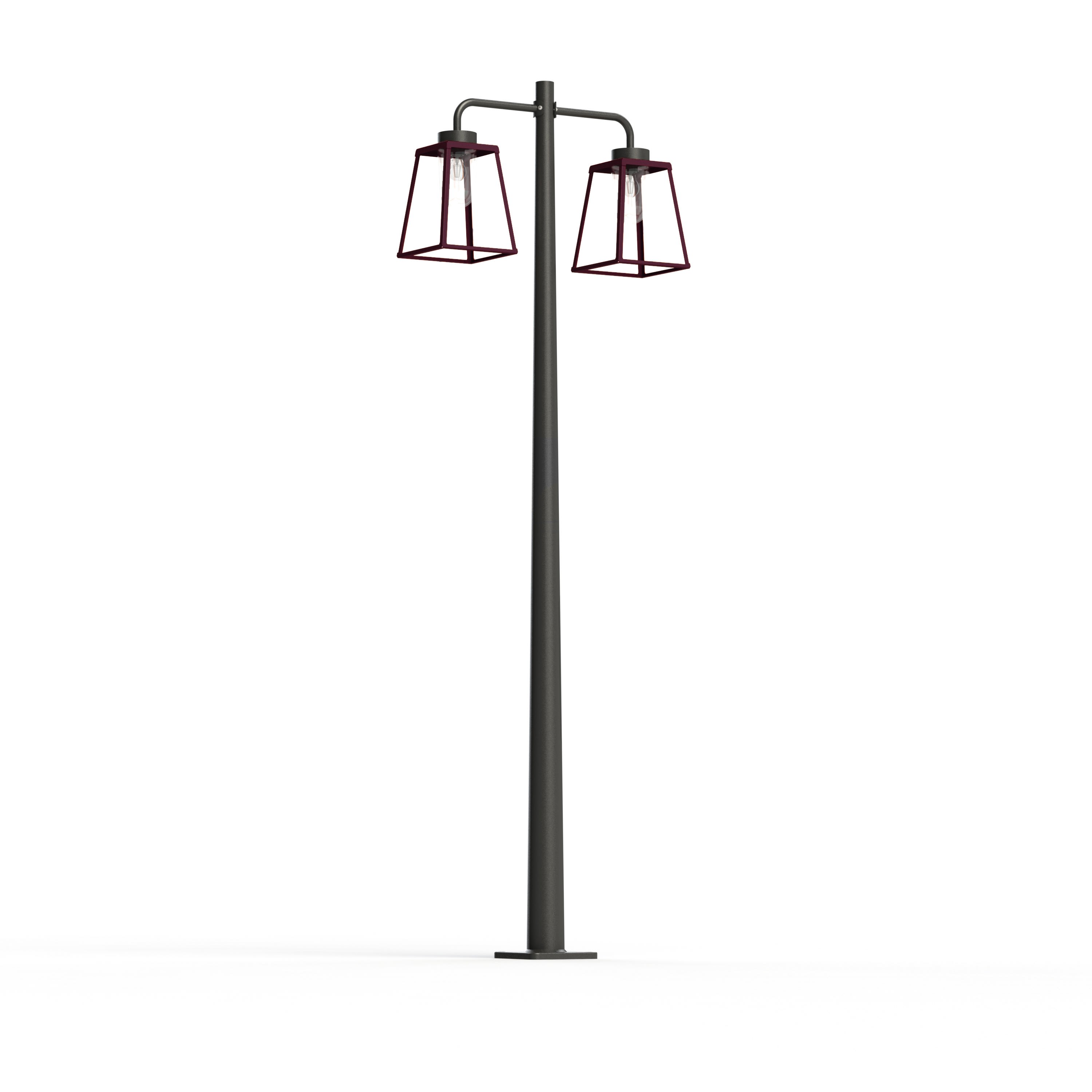 Lampadaire 2 têtes LAMPIOK 2 en aluminium, E27, IP65, classe 1, diffuseurs verre clair. Cage : teinte RAL 3005 Rouge vin 066. Mât, bras : teinte RAL 7021 Gris noir 107. Garantie 25 ans anticorrosion sur l'aluminium