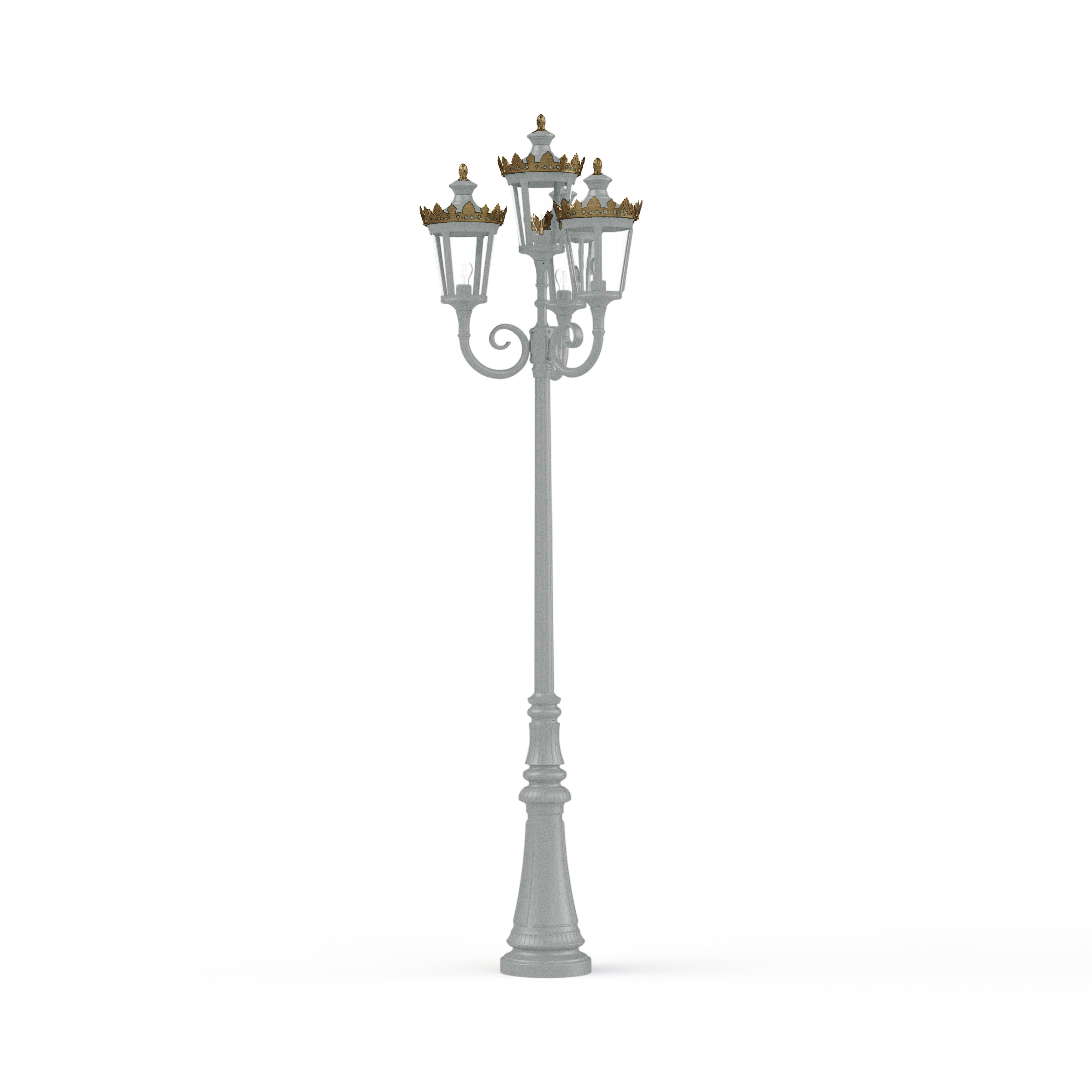 Lampadaire 4 têtes LOUVRE en aluminium, E27, IP44, classe 1, diffuseurs verre clair soufflé. Teinte RAL 7044 Gris soie 105, couronne dorée. Garantie 25 ans anticorrosion sur l'aluminium