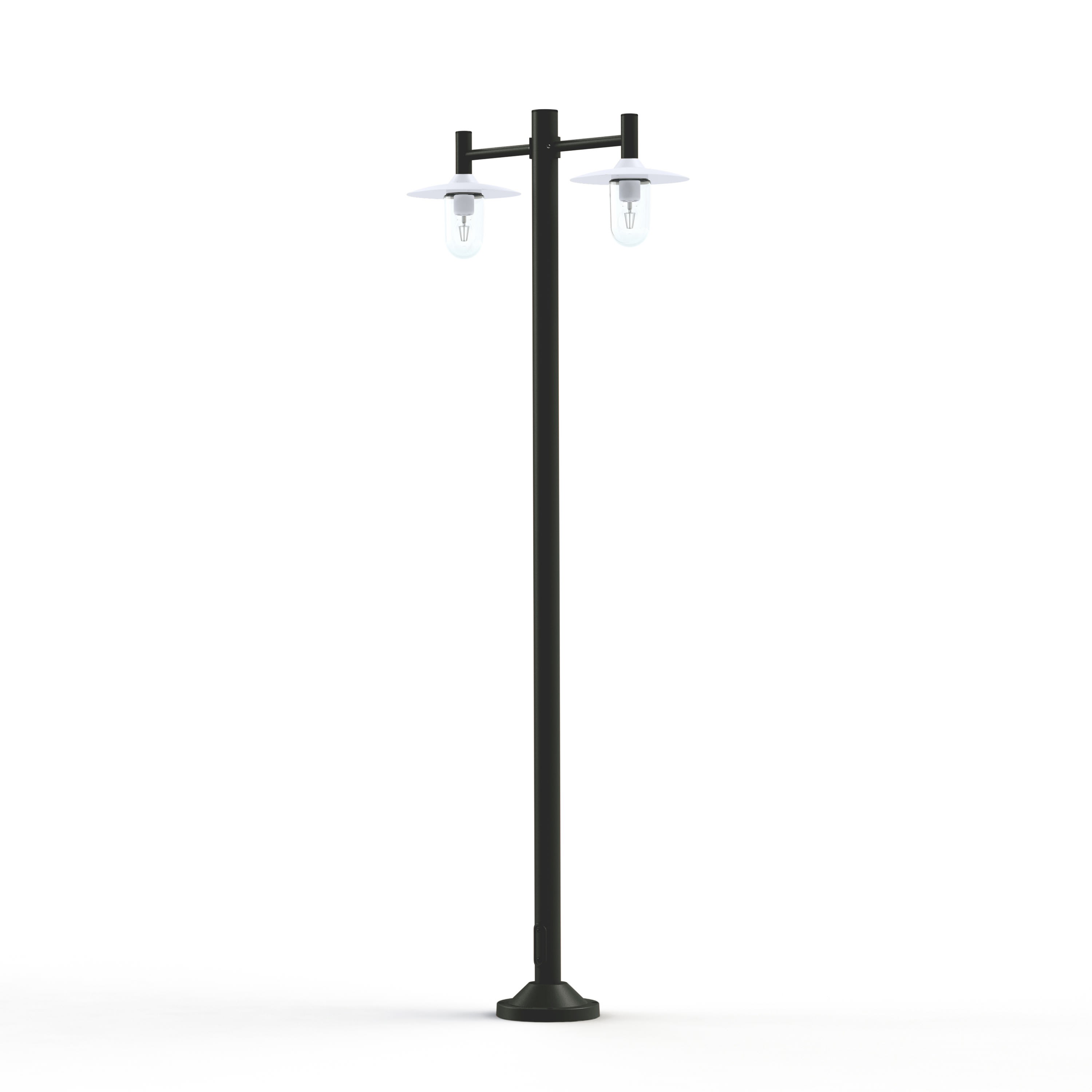 Lampadaire 2 têtes MONTANA en aluminium, E27, IP44, classe 1, diffuseurs verres clairs. Mât, bras Teinte RAL 7021 Gris noir 107, dômes en blanc. Garantie 25 ans anticorrosion sur l'aluminium