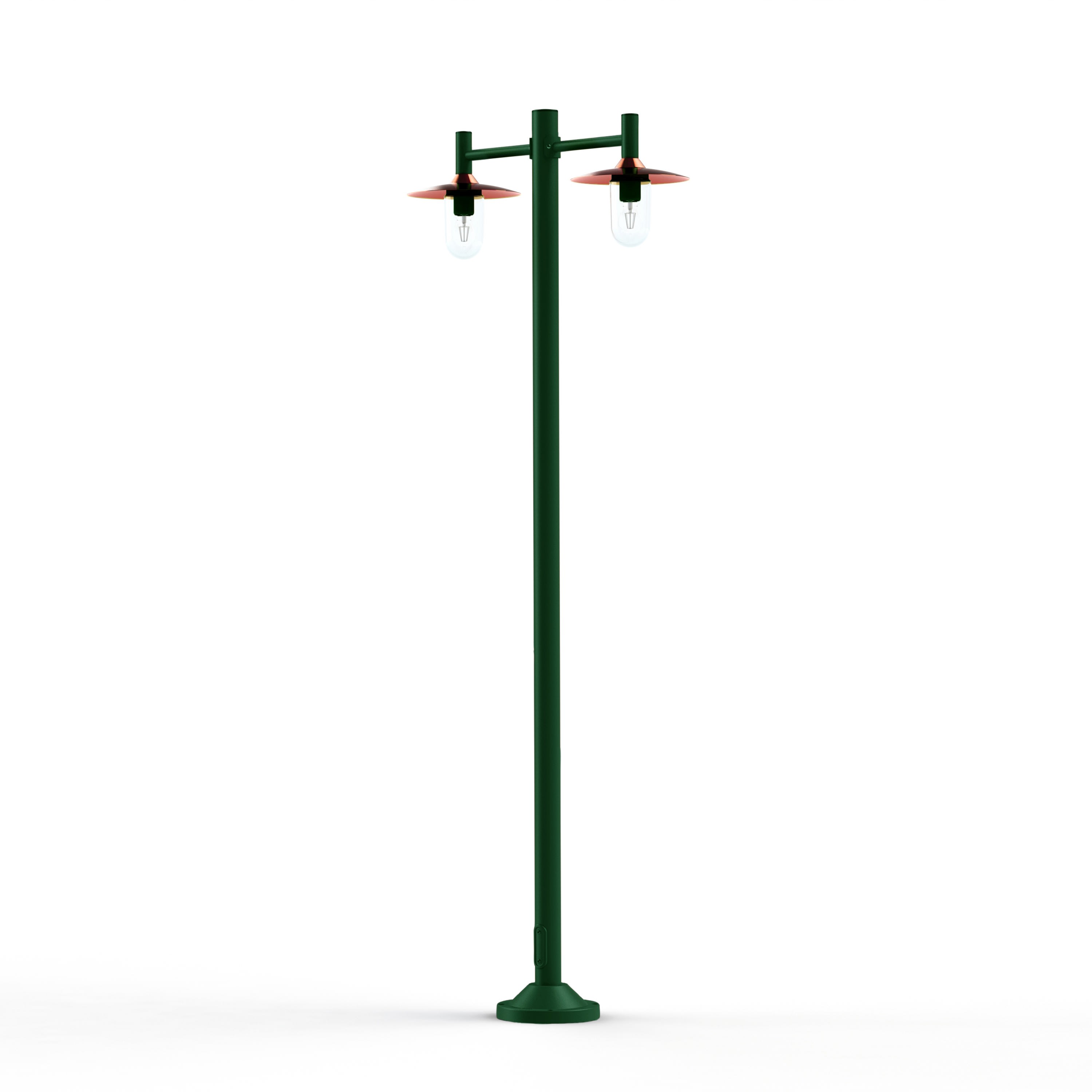 Lampadaire 2 têtes MONTANA, E27, IP44, classe 1, diffuseurs verre clair. Mât+bras en aluminium Teinte RAL 6009 Vert anglais 019 + dômes en cuivre brut