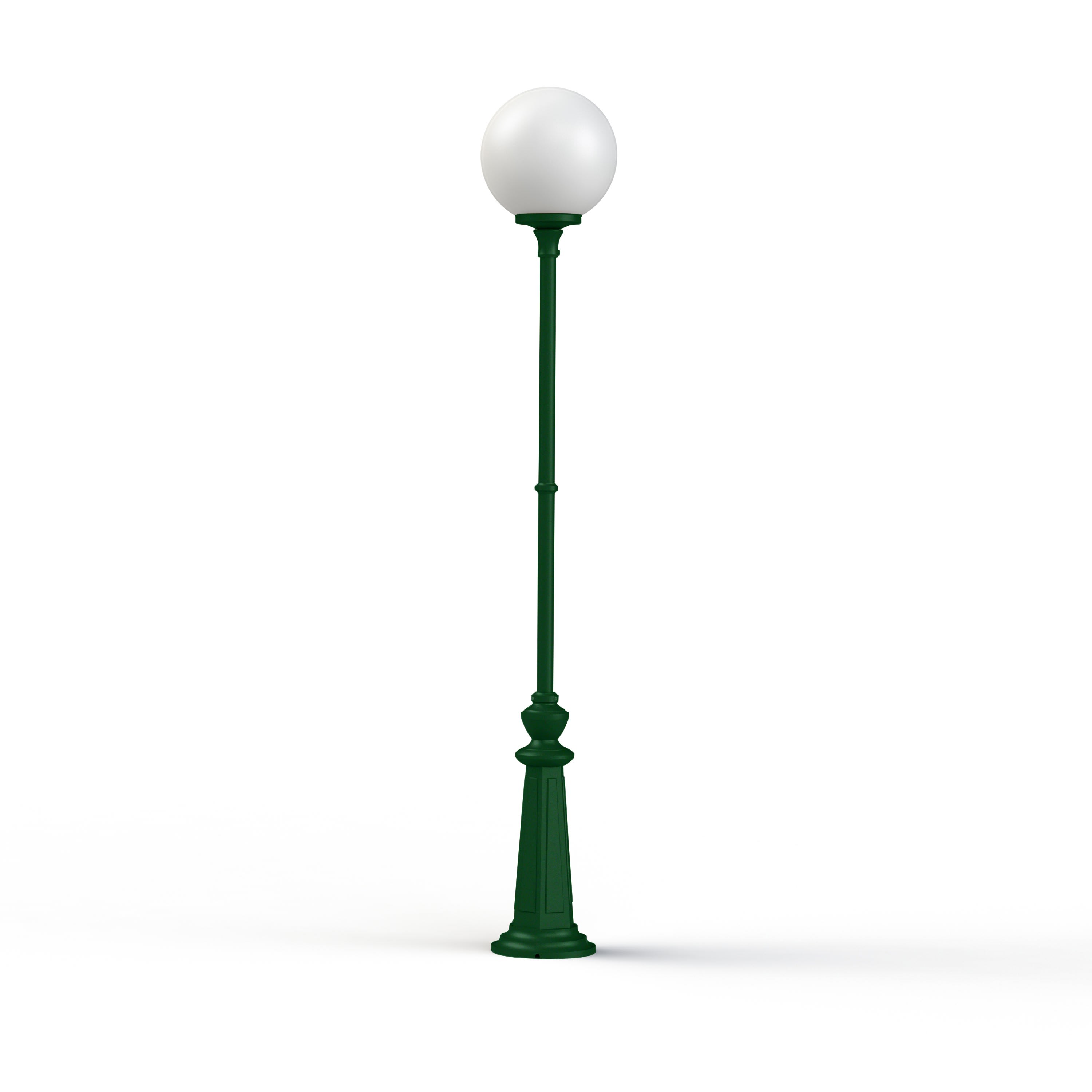 Lampadaire MOON, en aluminium, hauteur 1918mm, E27, IP44, IK08, classe 1, globe Ø 300 méthacrylate opale. Teinte RAL 6009 Vert sapin 067. Garantie 25 ans anticorrosion sur l'aluminium