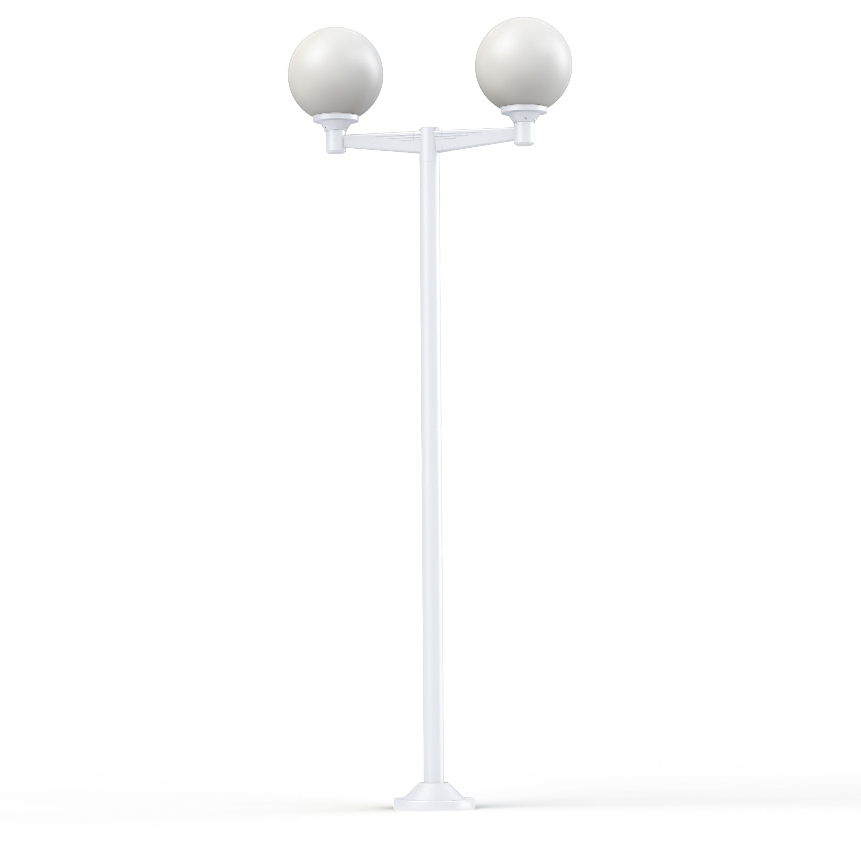 Lampadaire MOON 2 globes, en aluminium, hauteur 2456mm, E27, IP44, IK08, classe 1, globes Ø 300 méthacrylate opale. Teinte Blanc 001. Garantie 25 ans anticorrosion sur l'aluminium