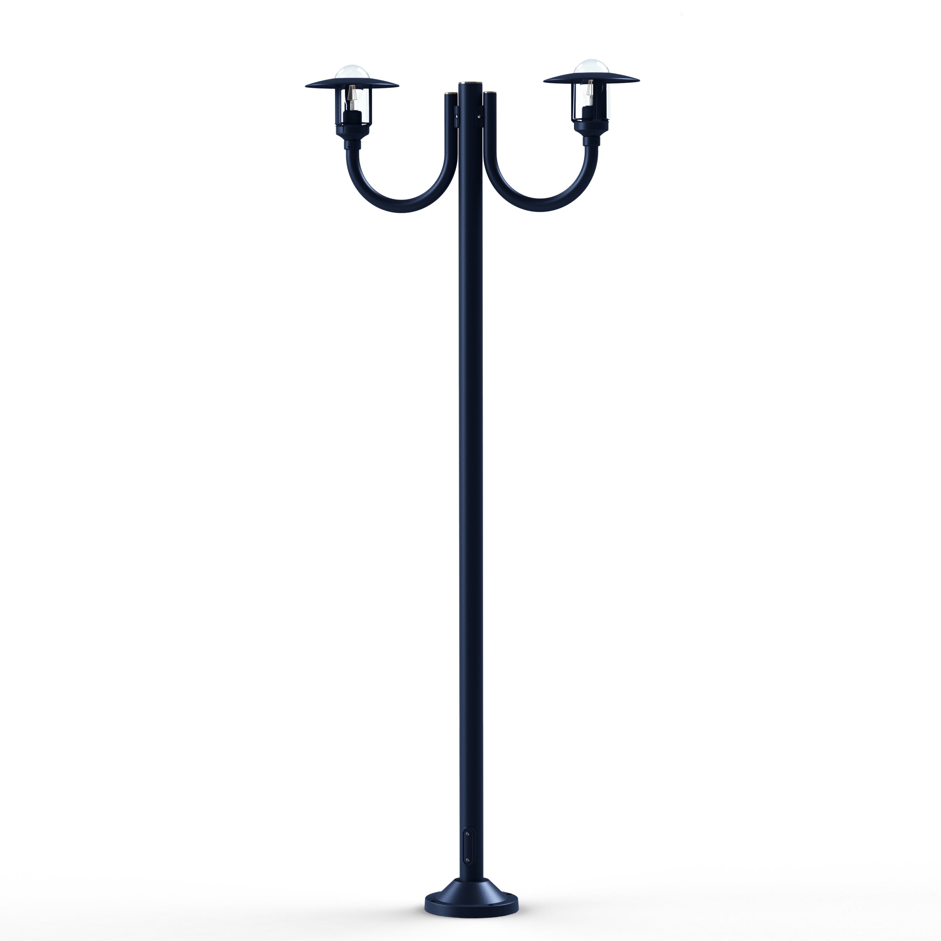 Lampadaire 2 têtes bras courbes NEWPARK en aluminium, E27, IP44, classe 1, diffuseurs verre clair. Teinte RAL 5011 Bleu acier 065. Garantie 25 ans anticorrosion sur l'aluminium