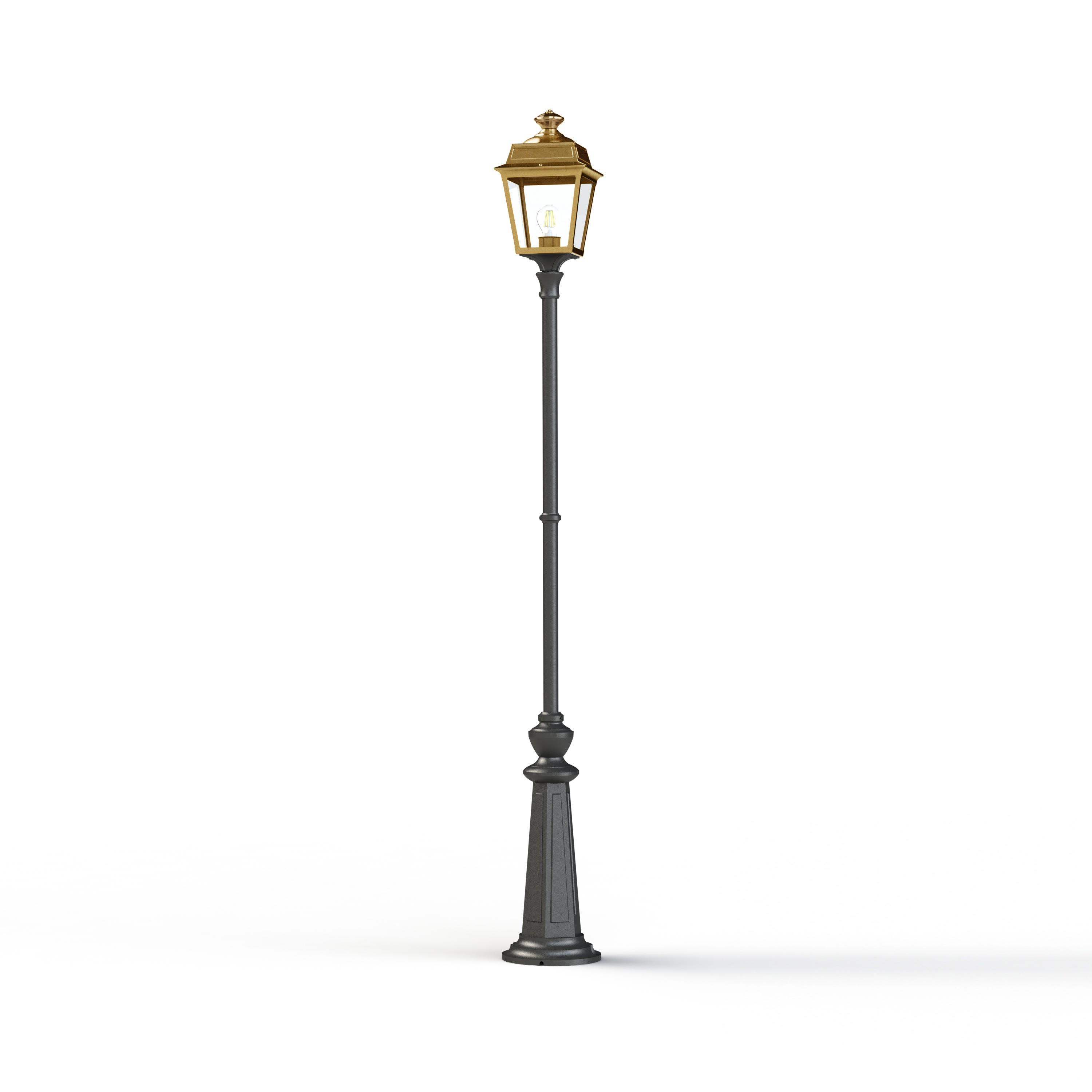 Lampadaire 1 tête PLACE DES VOSGES TRADITION, hauteur 1967mm, E27, IP44, classe 1, diffuseurs verre clair. Matière lanterne : laiton vernis teinté 070. Matière mât : aluminium, teinte RAL 9005 noir foncé 000