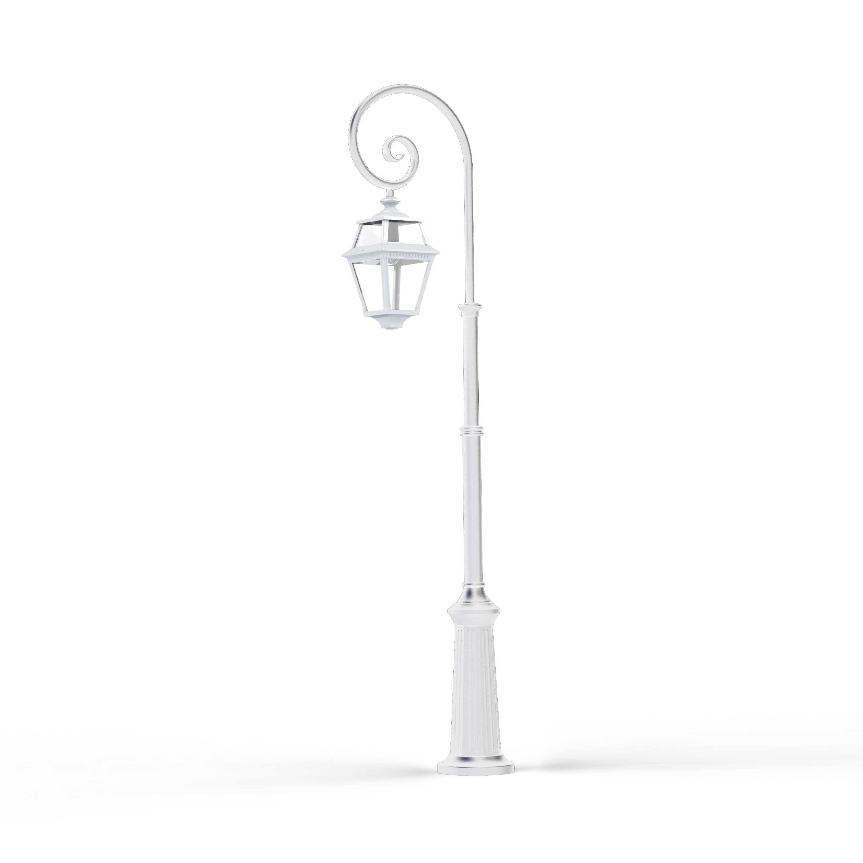 Lampadaire 1 tête avec crosse PLACE DES VOSGES 2 en aluminium, hauteur 2332-2773mm, E27, IP44, classe 1, diffuseurs verre clair. Teinte Blanc 001. Garantie 25 ans anticorrosion sur l'aluminium