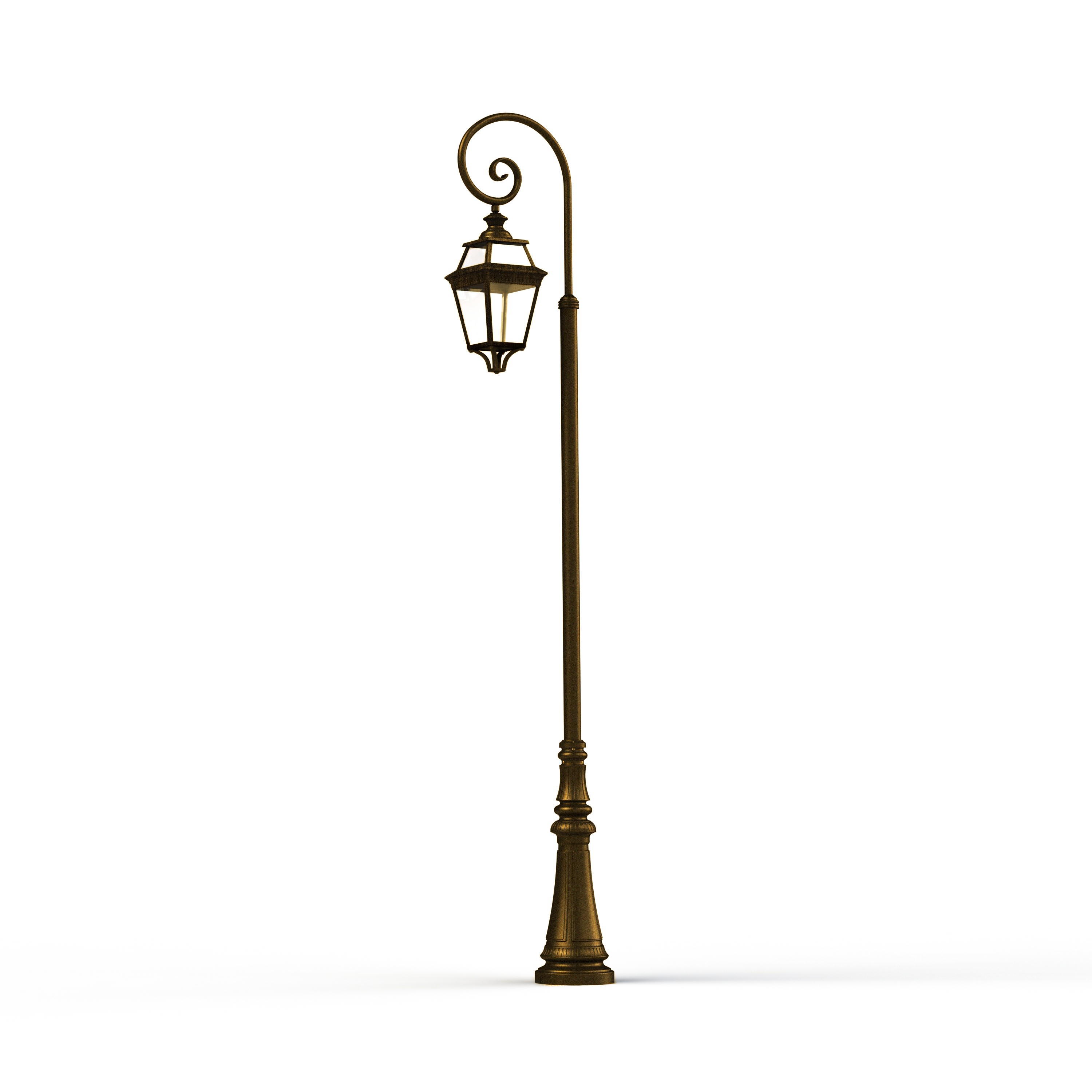 Lampadaire 1 tête avec crosse PLACE DES VOSGES 3 en aluminium, E27, IP44, classe 1, diffuseurs verre clair. Finition Patine dorée 009. Garantie 25 ans anticorrosion sur l'aluminium
