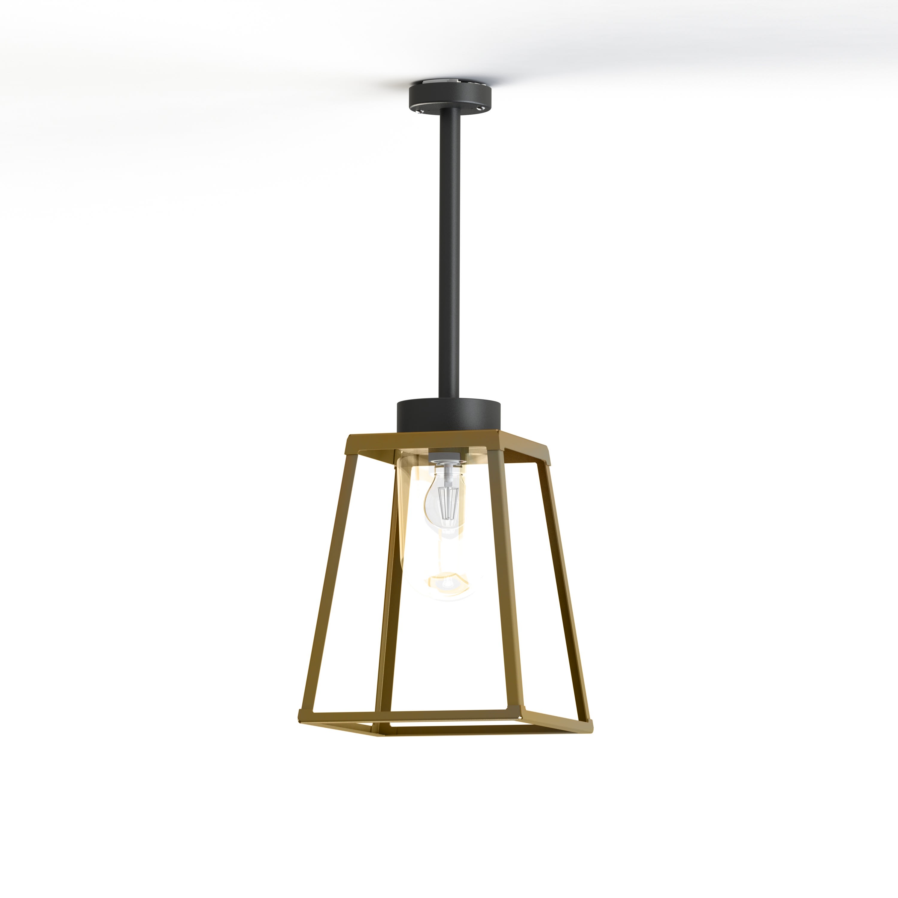 Plafonnier LAMPIOK 2, E27, IP65, classe 1, diffuseur verre clair. Matière cage : laiton vernis teinté 070. Matière tige suspension : aluminium, teinte RAL 7021 Gris noir 107