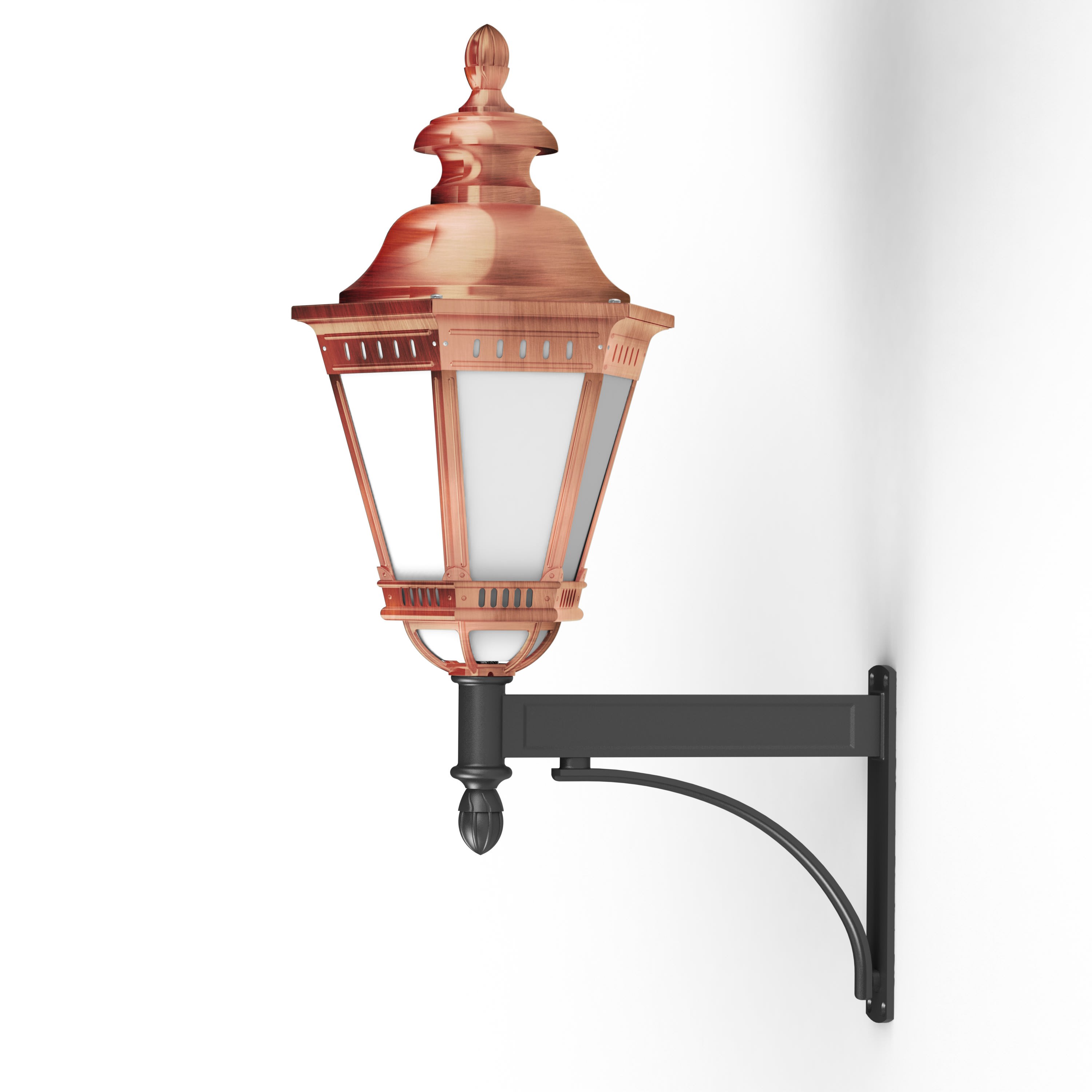 Applique montante CITADELLE, E27, IP66, classe 1, vasque méthacrylate opale. Matière lanterne : cuivre patiné non vernis 083. Matière potence : aluminium. Teinte RAL 9005 noir foncé 000