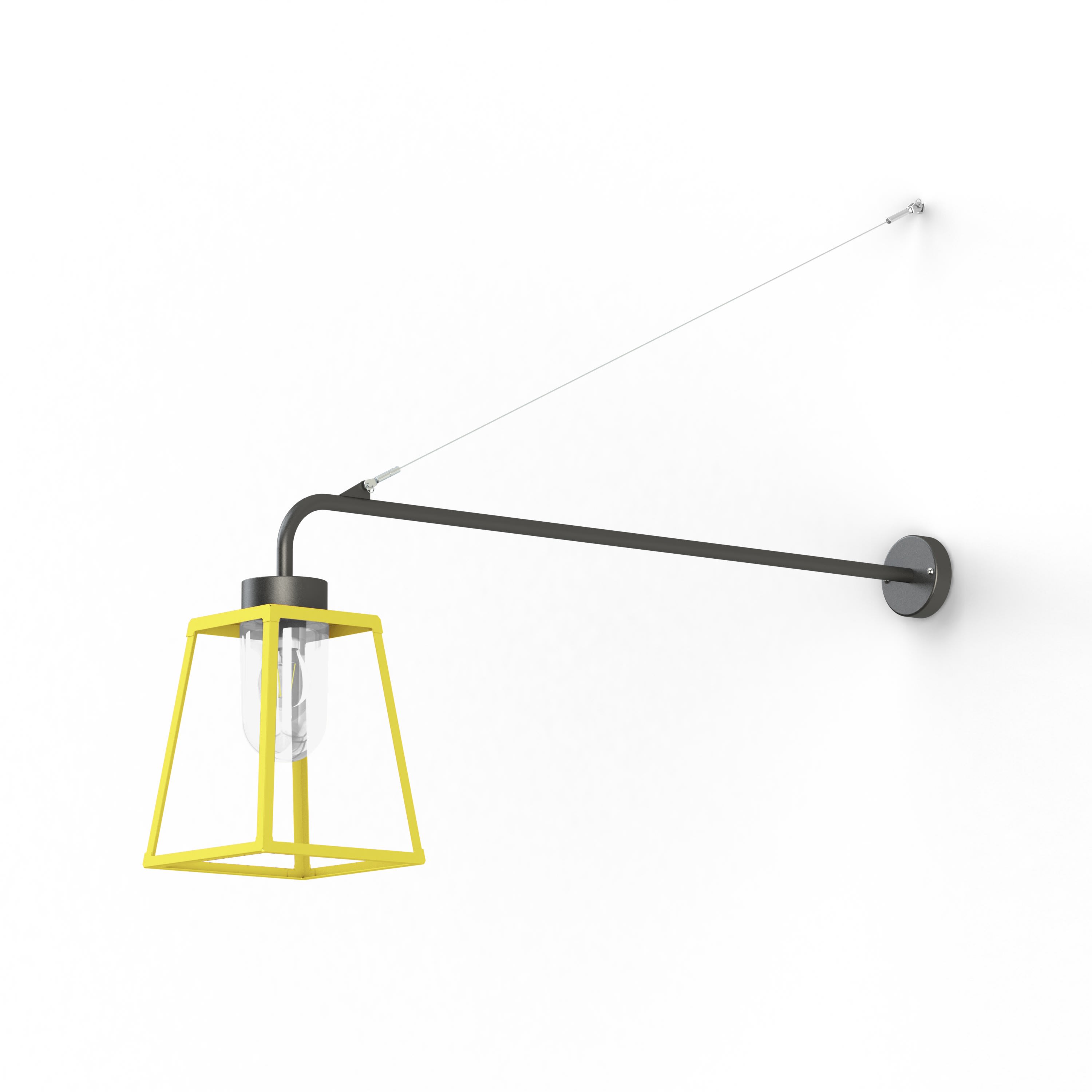 Applique descendante LAMPIOK 1, avec hauban, en aluminium, E27, IP65, classe 2, diffuseur verre clair. Cage : teinte RAL 1016 Jaune soufre 068. Potence : teinte RAL 7021 Gris noir 107. Garantie 25 ans anticorrosion sur l'aluminium
