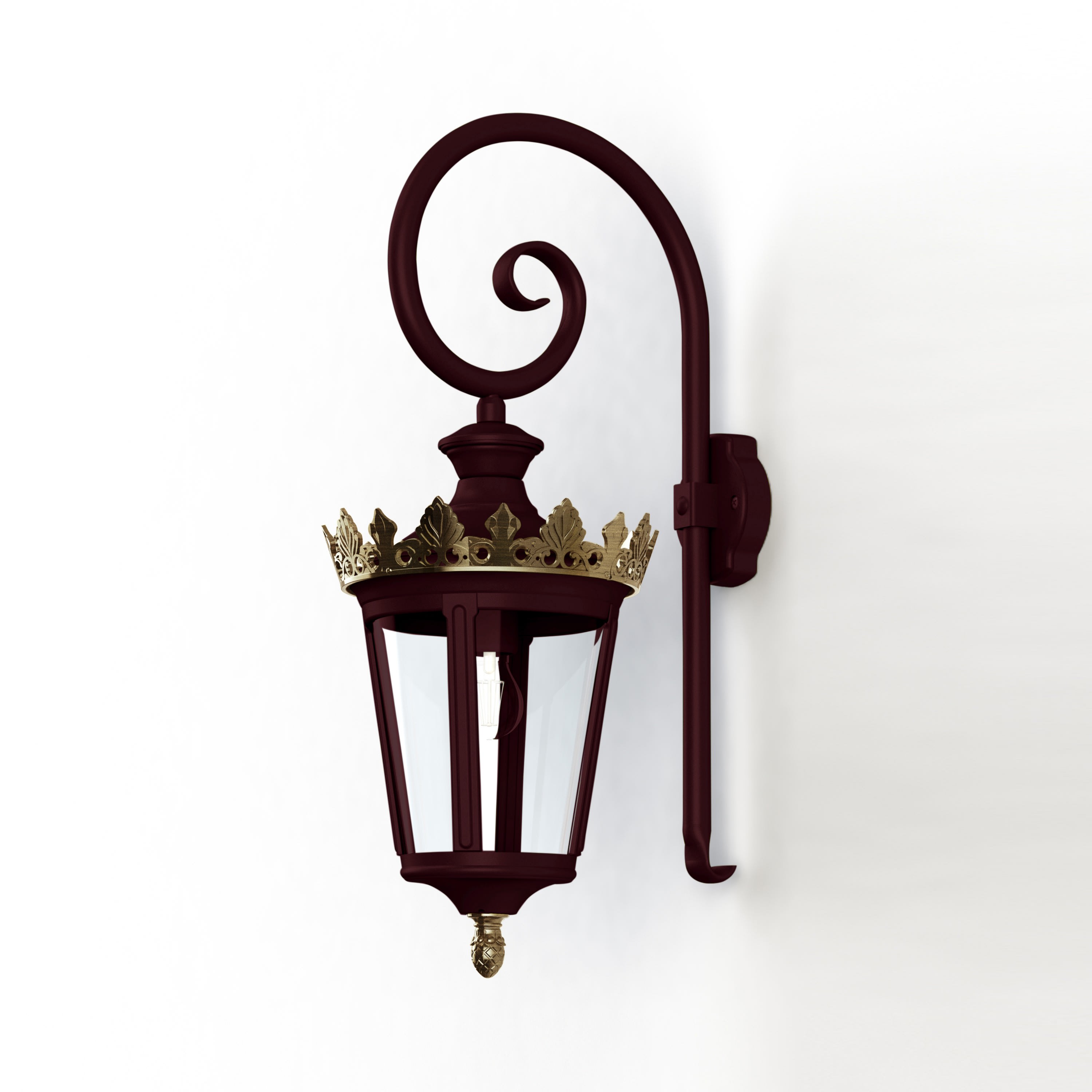 Applique crosse LOUVRE en aluminium, E27, IP44, classe 1, diffuseur verre clair soufflé. Teinte RAL 3005 Rouge vin 066, couronne dorée. Garantie 25 ans anticorrosion sur l'aluminium